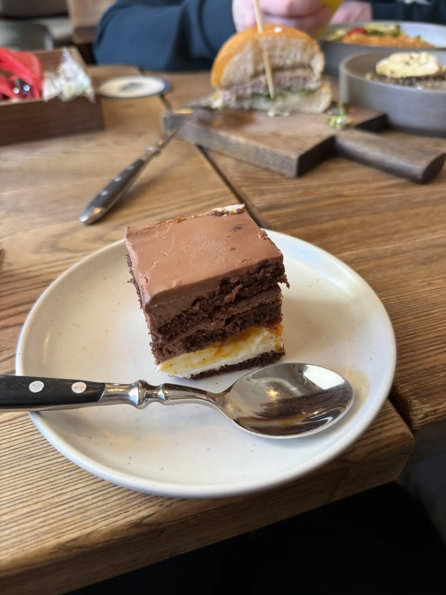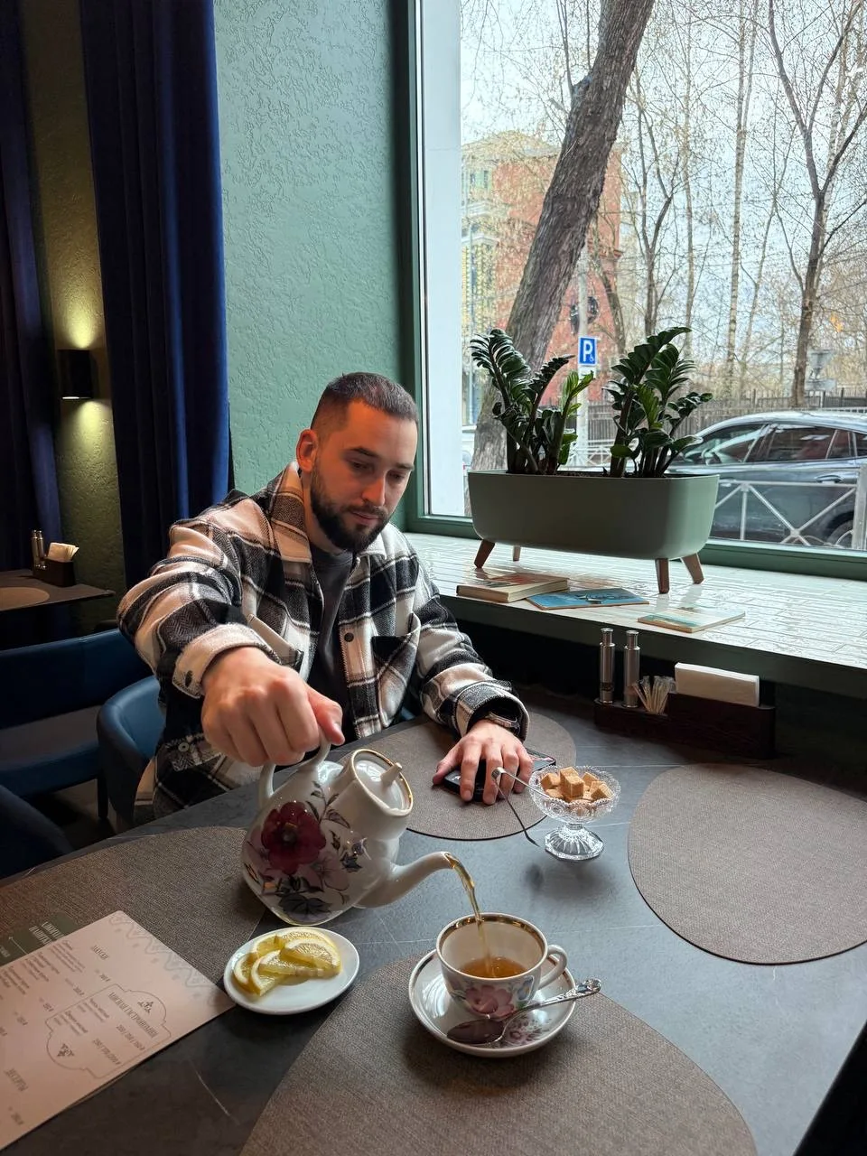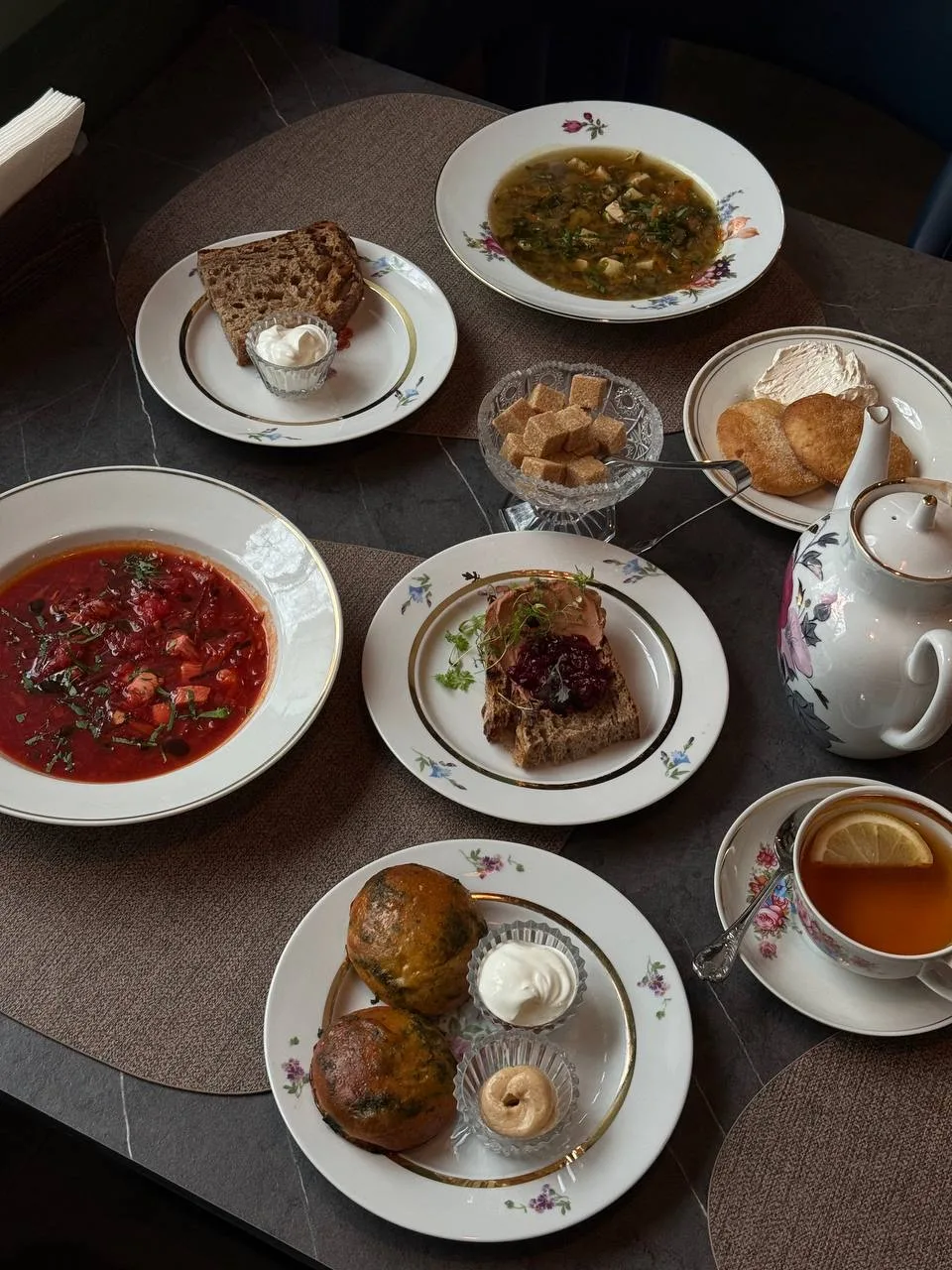Ну а к чаю с бергамотом и мятой идельно подошел их фирменный десерт – гречневые блины с бородинской карамелью, маскарпоне и вишней.