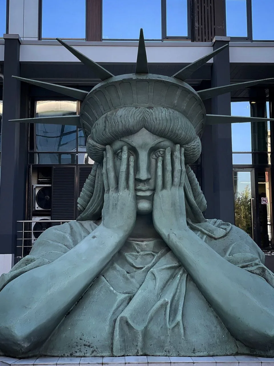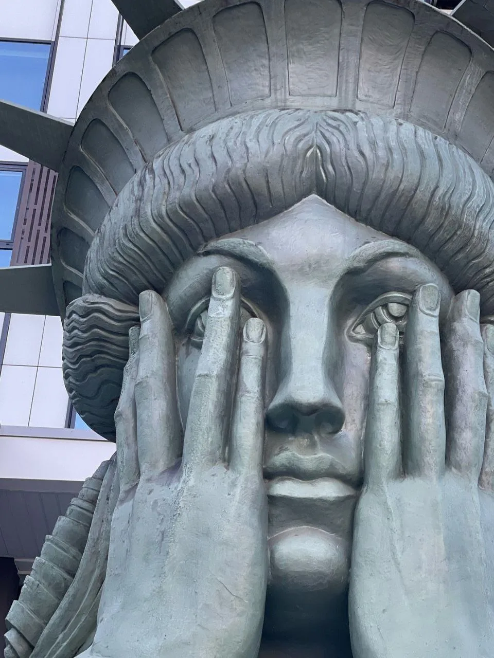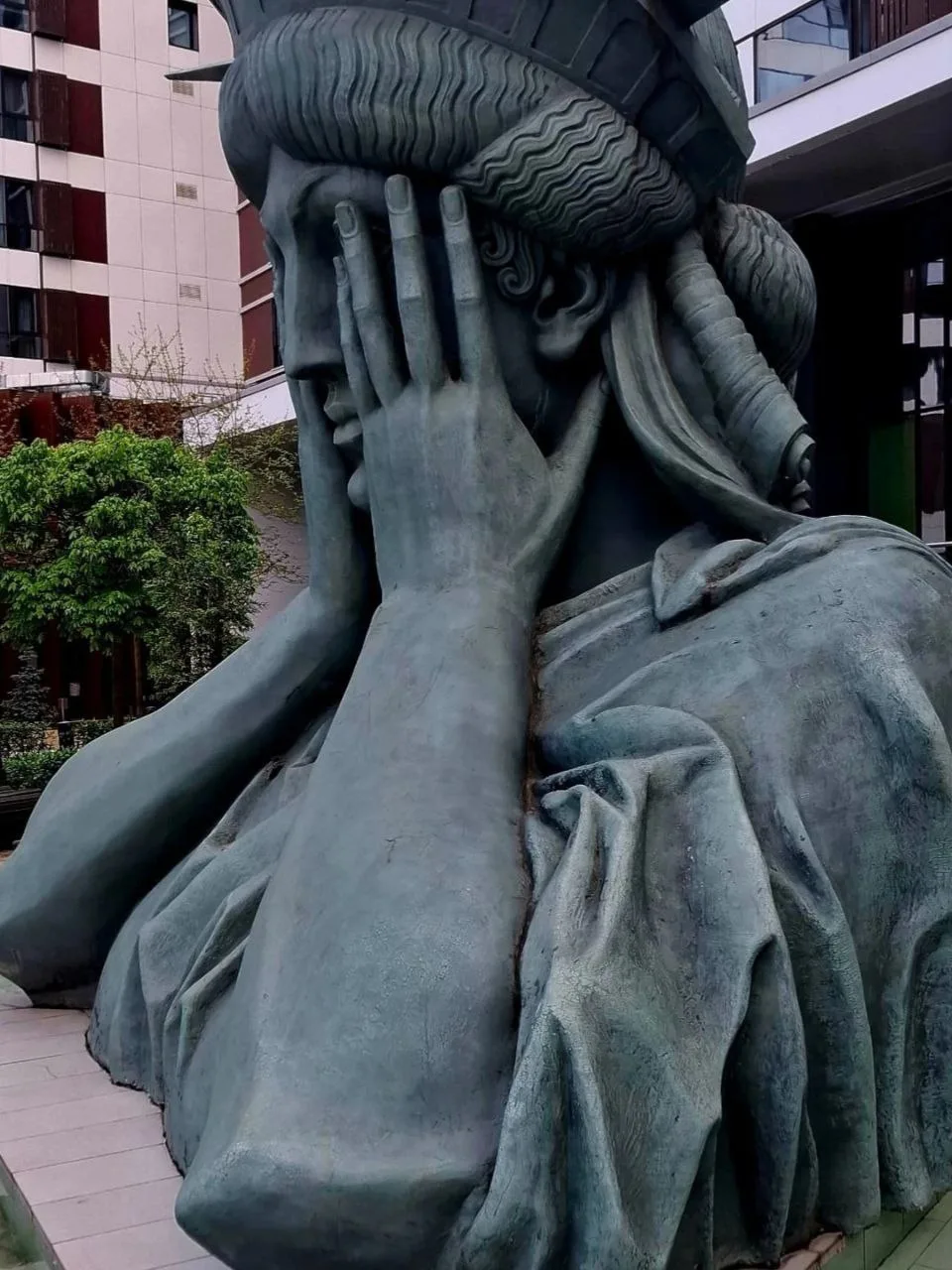 🗽 Плачущая «Голова Статуи Свободы» — лицо закрыто руками, а сама скульптура установлена в небольшом бассейне