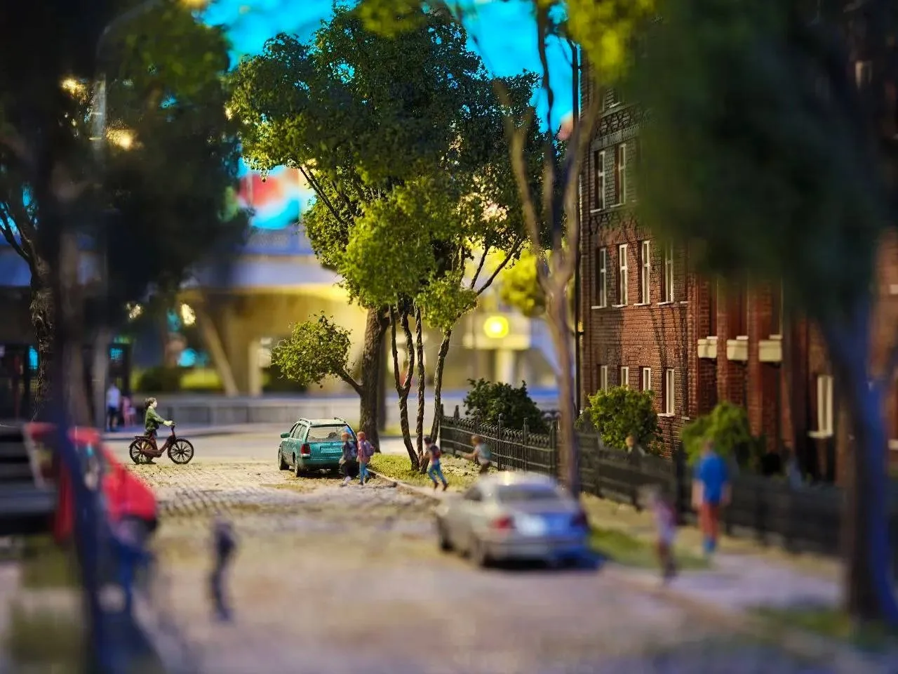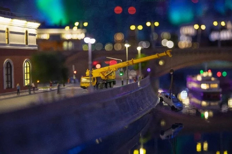 🟡 Динамичная экспозиция: по дорогам движется транспорт, сменяются день и ночь, звучат городские шумы.