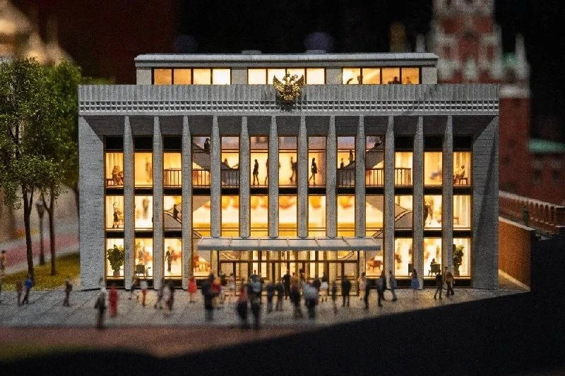 🟡 Большой макет страны с миниатюрами ключевых регионов: Москвы, Петербурга, Калининградской области, Кавказа, Крыма, Сочи, Алтая, Урала и северных территорий.