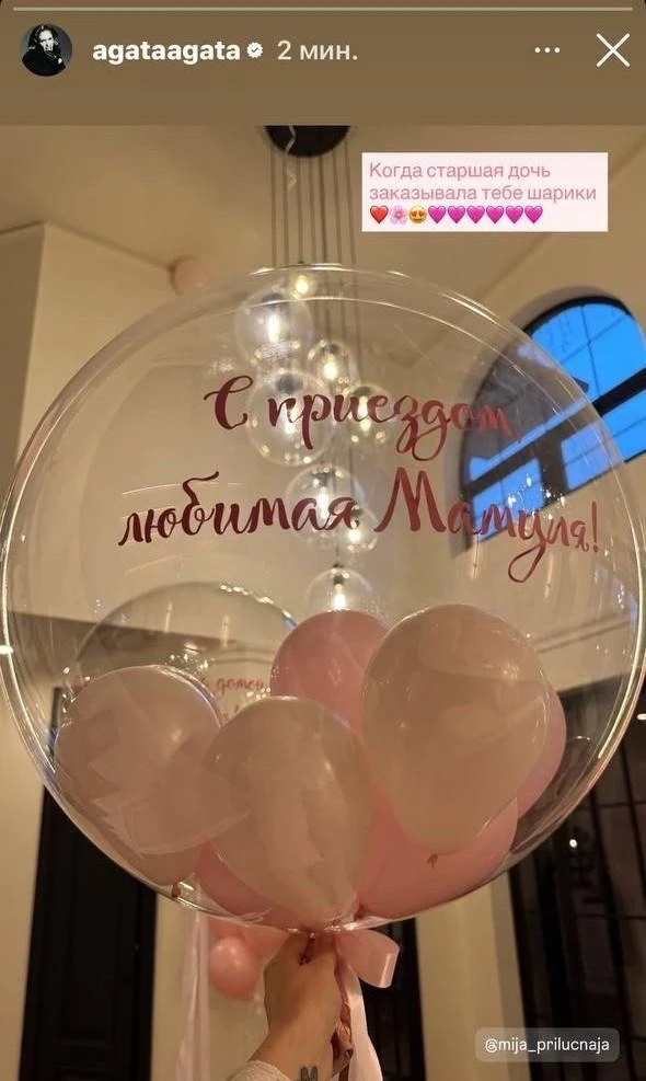 Дома актрису ждал сюрприз от старшей дочери Мии. Девочка заказала воздушный шар с надписью «С приездом, любимая мамуля», что очень тронуло Агату.