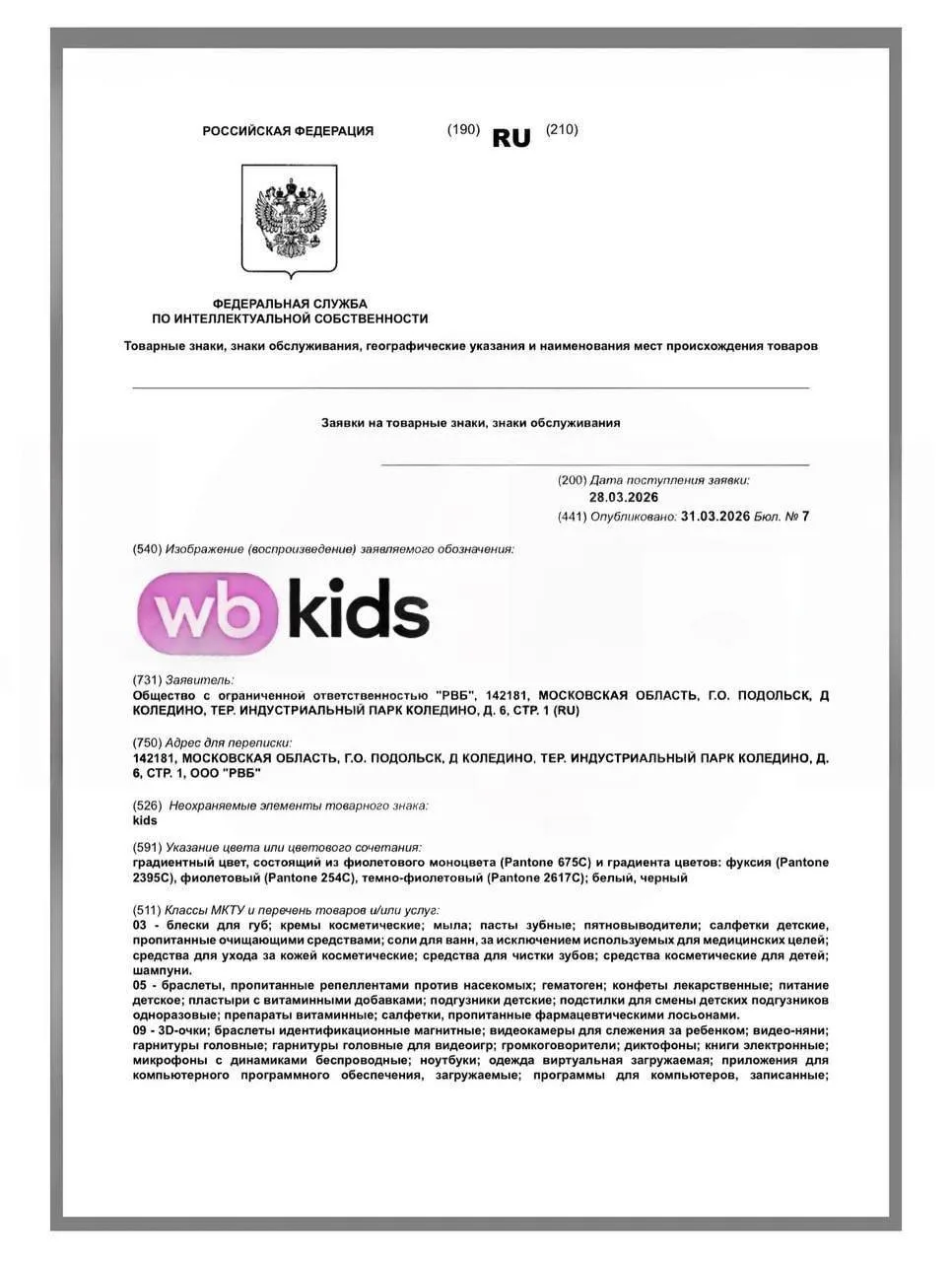 Wildberries будет выпускать косметику и электронику для детей. Компания зарегистрировала ещё один товарный знак — WB Kids.