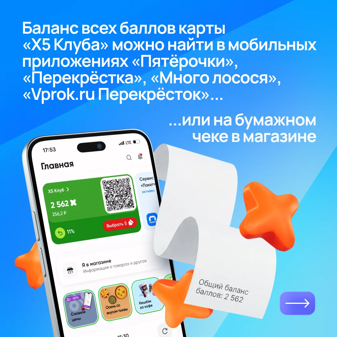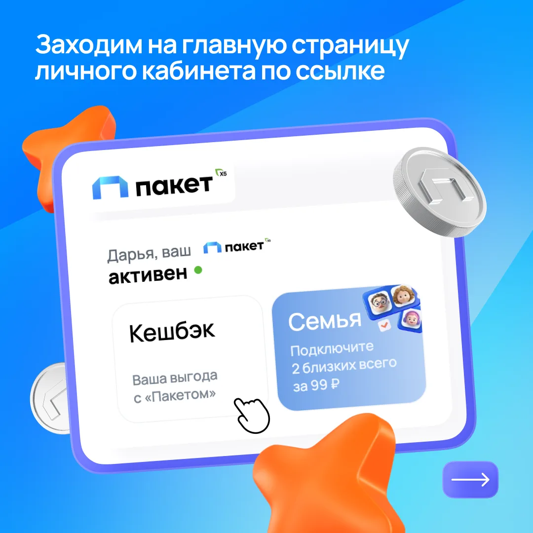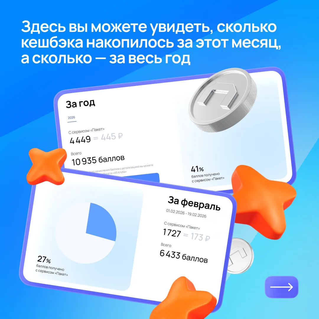 Сервис «Пакет» помогает получать до 50% кешбэка на карту лояльности «Х5 Клуба» в магазинах «Пятёрочка» и «Перекрёсток».