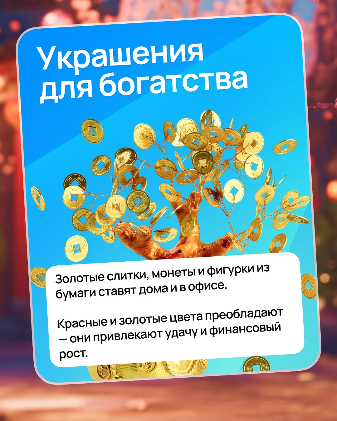 Листайте карточки и смотрите китайские традиционные приметы о деньгах. А с сервисом «Пакет» ваши покупки станут ещё выгоднее – увеличенный кешбэк помогает приумножать удовольствие!
