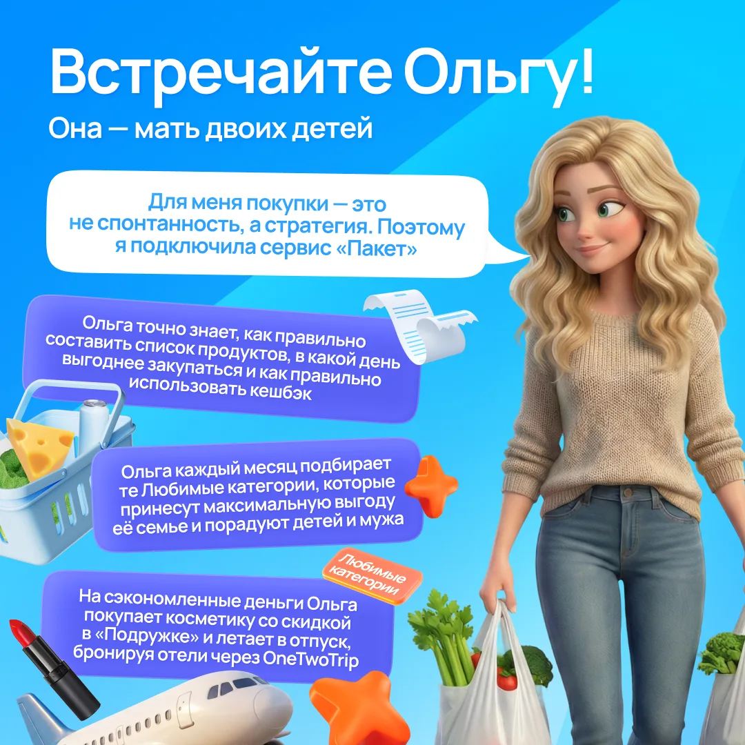 С сервисом «Пакет» Ольга получает кешбэк с привычных покупок, и за месяц сумма складывается в приятный бонус к семейному бюджету.