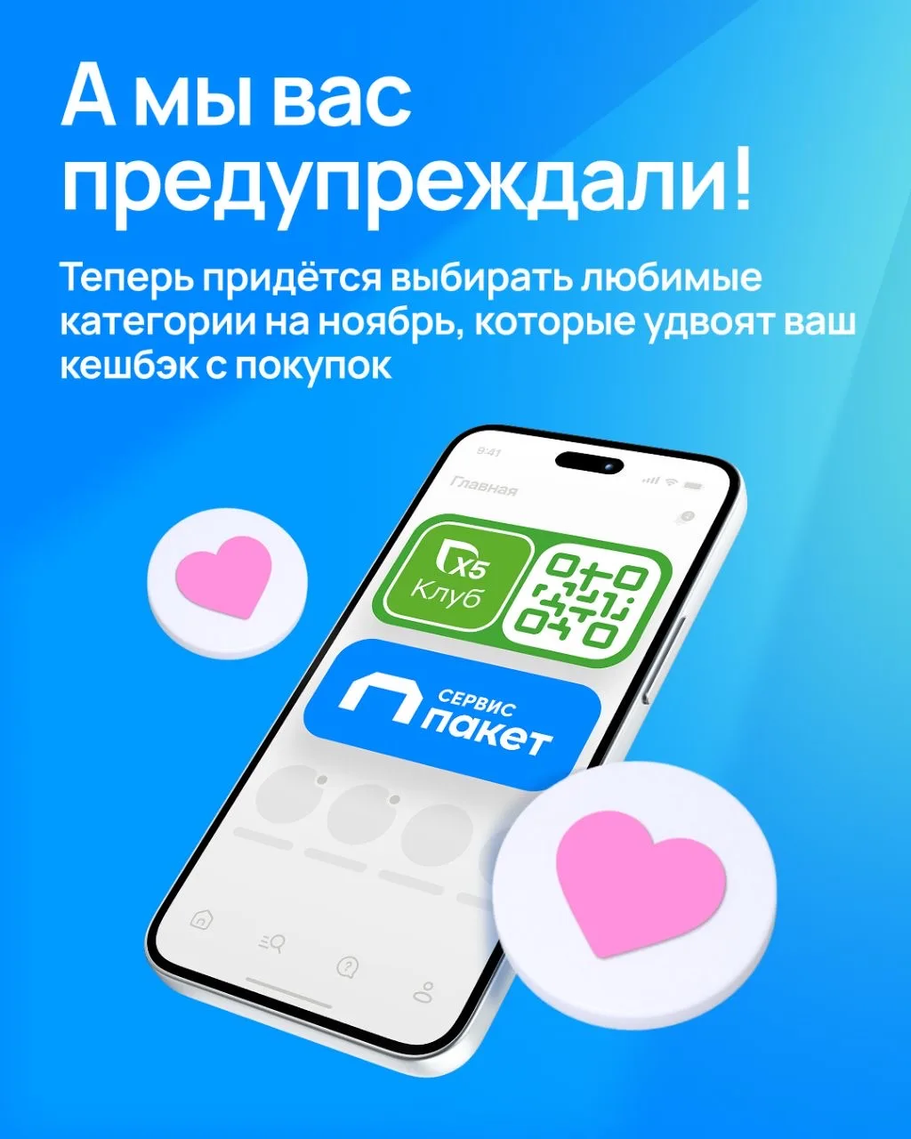 С сервисом «Пакет» вы можете каждый месяц выбирать по 5 любимых категорий в мобильном приложении «Пятёрочка» и «Перекрёсток», а кешбэка с покупок вернётся в два раза больше!