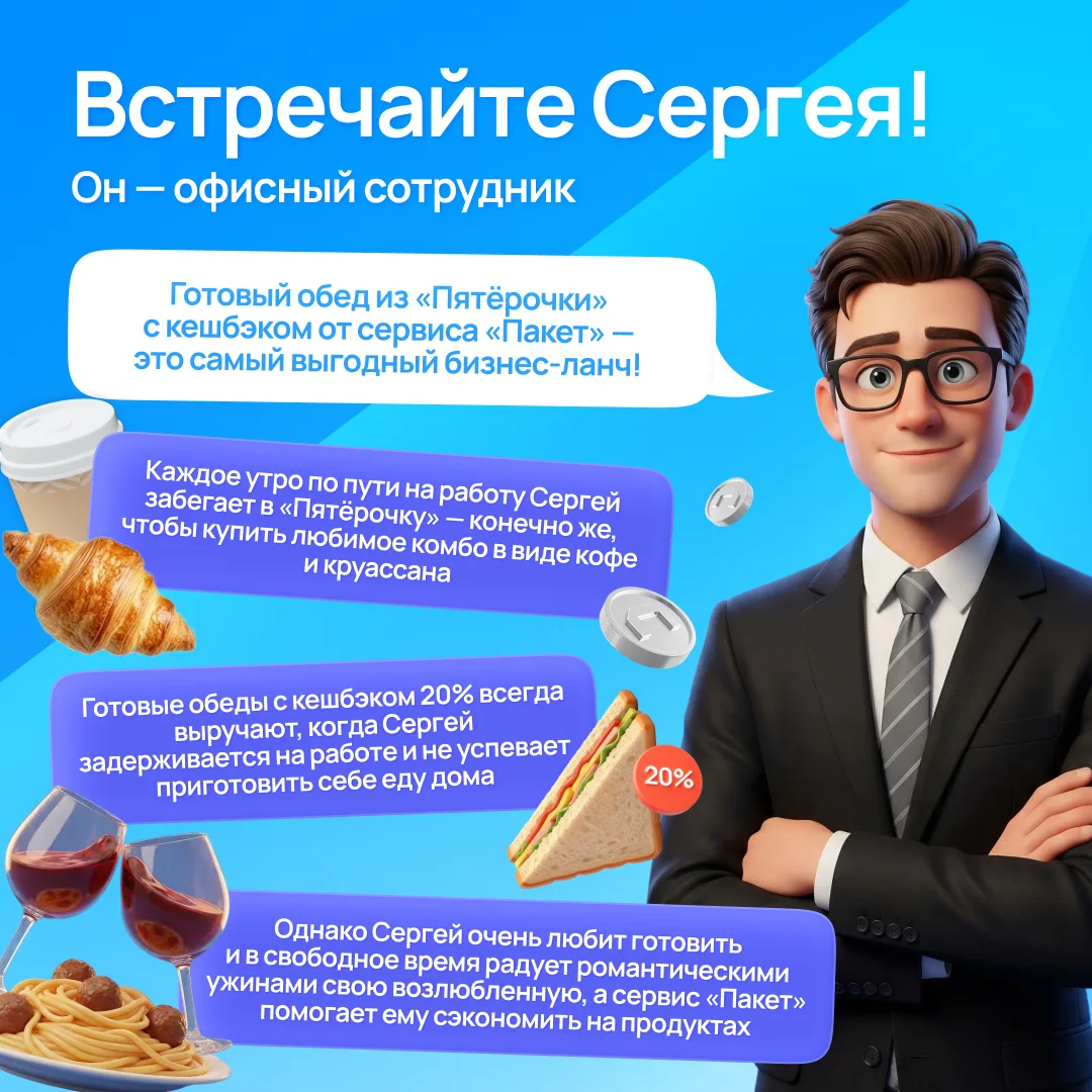 Сергей — очень занятой человек, но даже так он успевает забегать в «Пятёрочку», чтобы купить продукты с приятным кешбэком от сервиса «Пакет».
