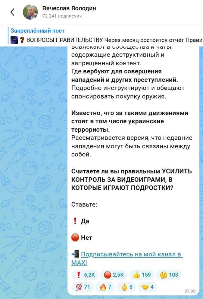 Вячеслав запустил голосование в госсмесенджере о необходимости усиления контроля за видеоиграми. По его мнению, увлечение играми может быть связано с подростковыми нападениями на школы и колледжи.