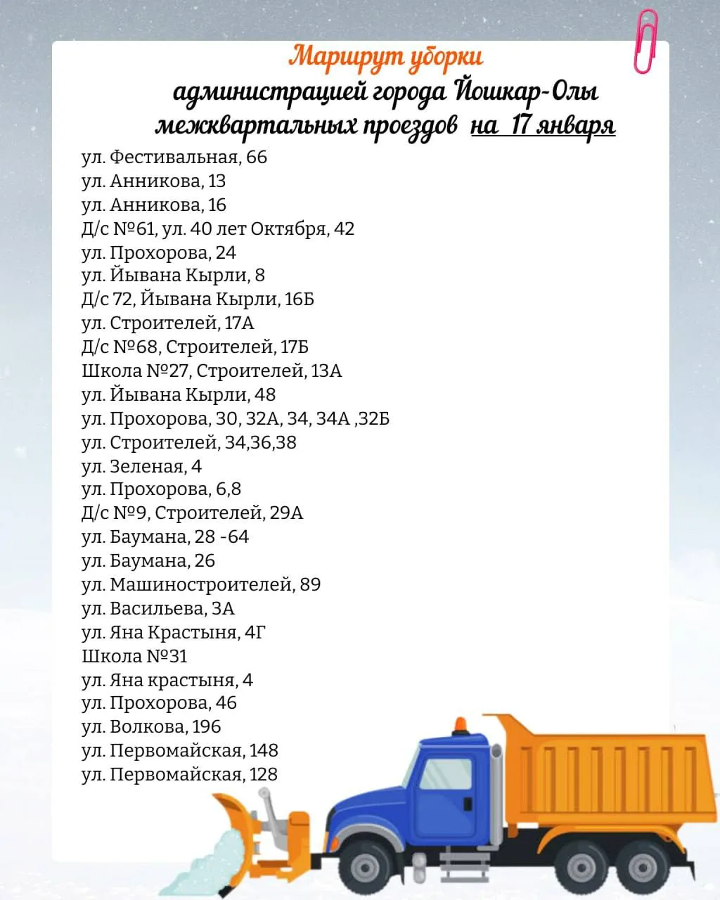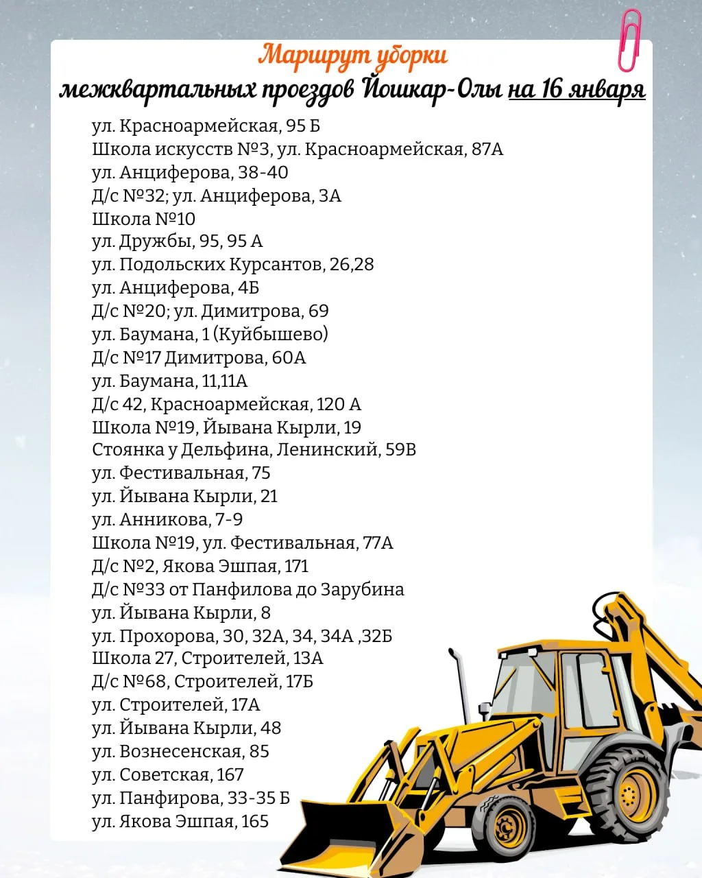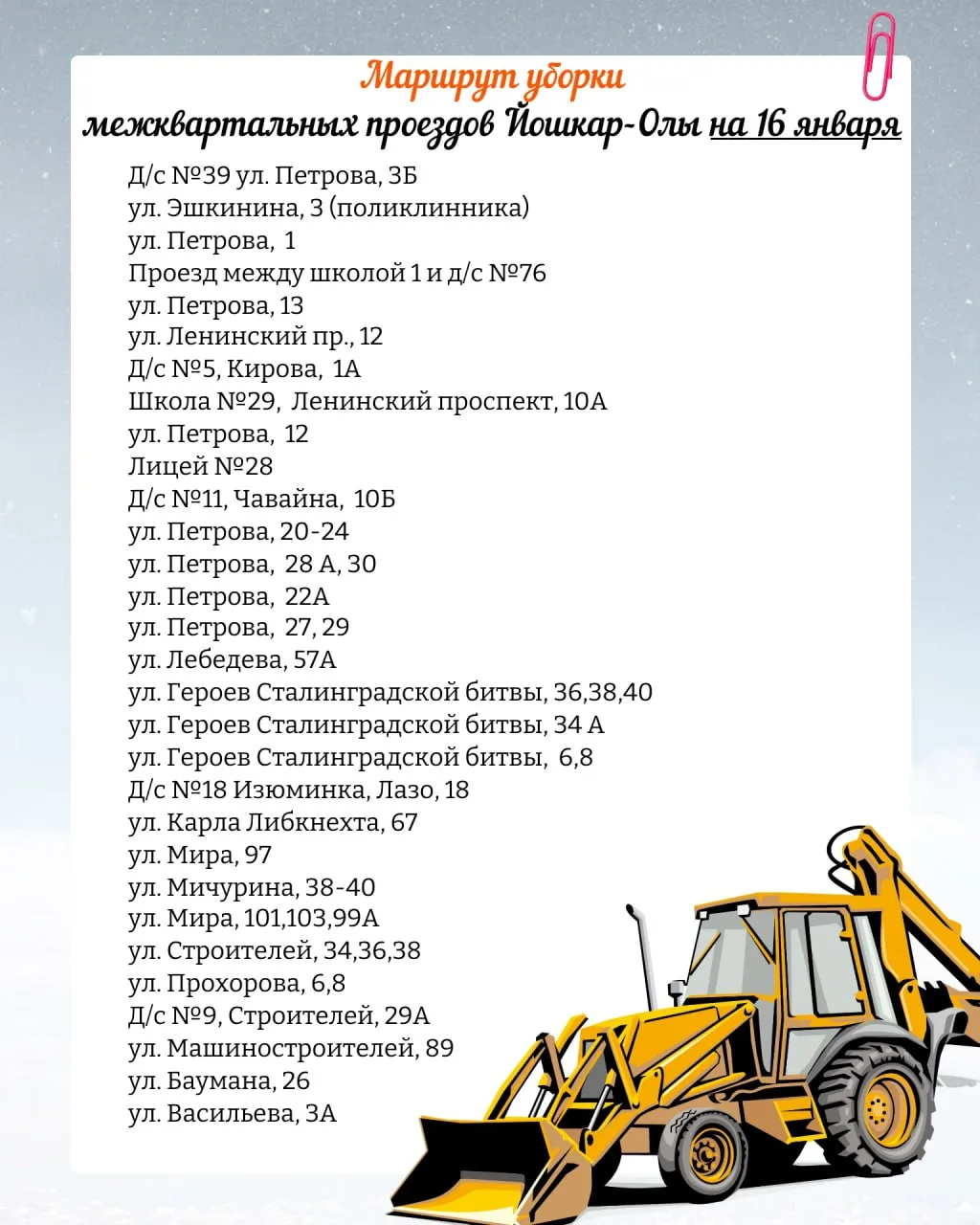Планируемый маршрут движения снегоуборочной техники по расчистке межквартальных проездов на 16 января 2026 года.