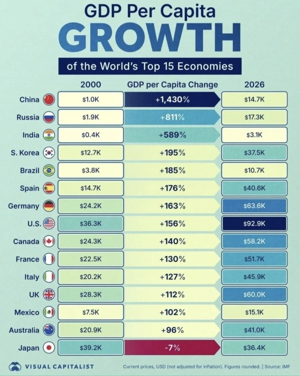 Заметьте не наши, а самые что ни наесть западные аналитики опубликовали занятную табличку - Насколько изменился ВВП на душу населения за 26 лет.