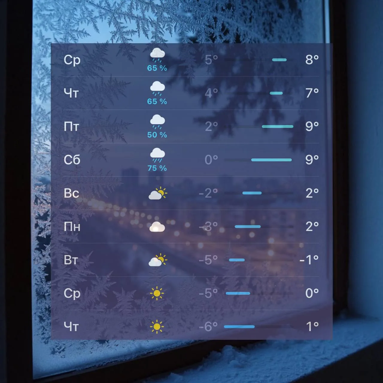 Температура воздуха сегодня до +9°С, ночью +3°С. Ветер до 7 м/с 💨