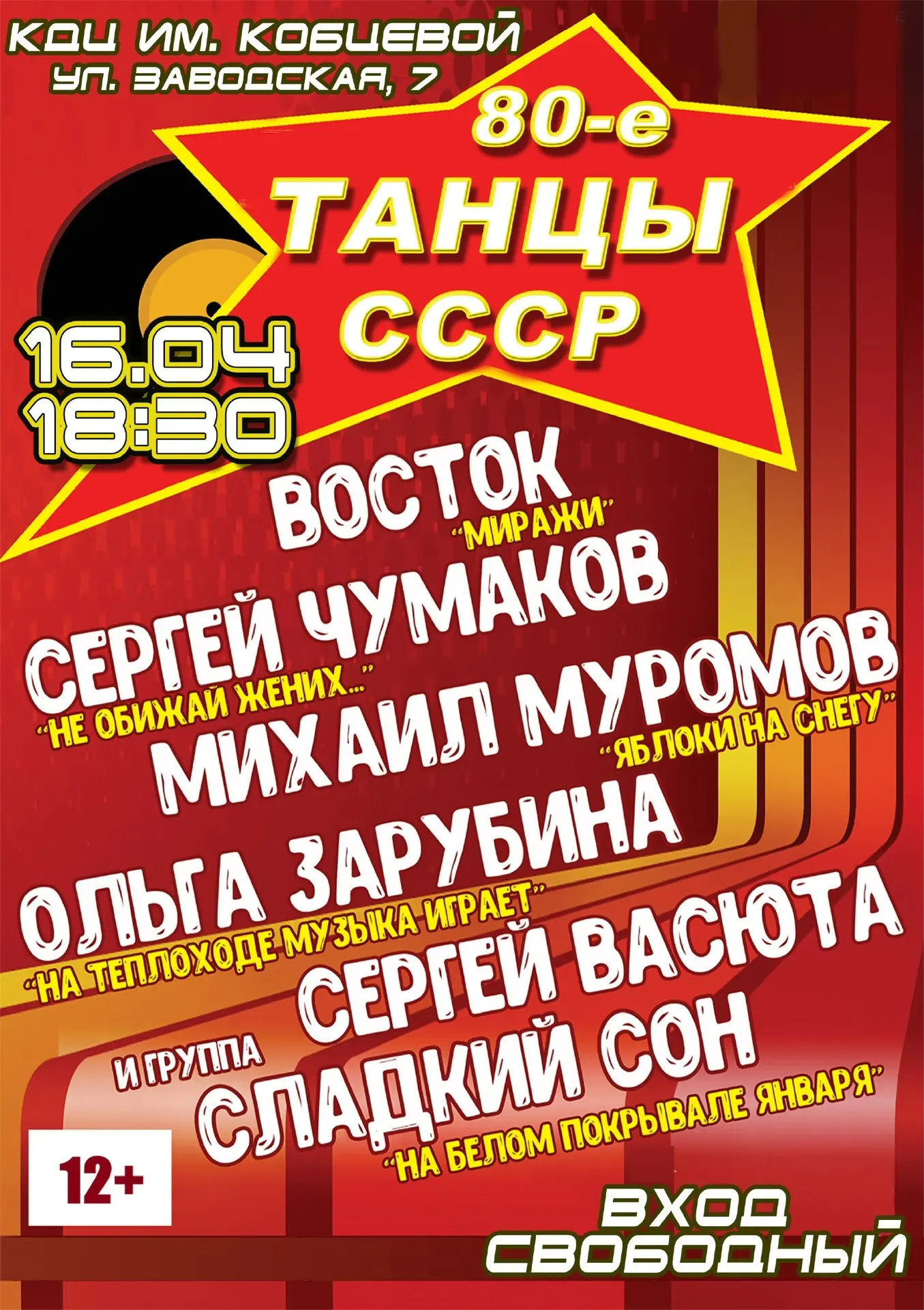 ✨16 апреля в 18.30 в КДЦ им. Н.С. Кобцевой пройдет мероприятие, на котором вы не только услышите, но и сможете потанцевать под самые популярные и любимые песни 80-х.