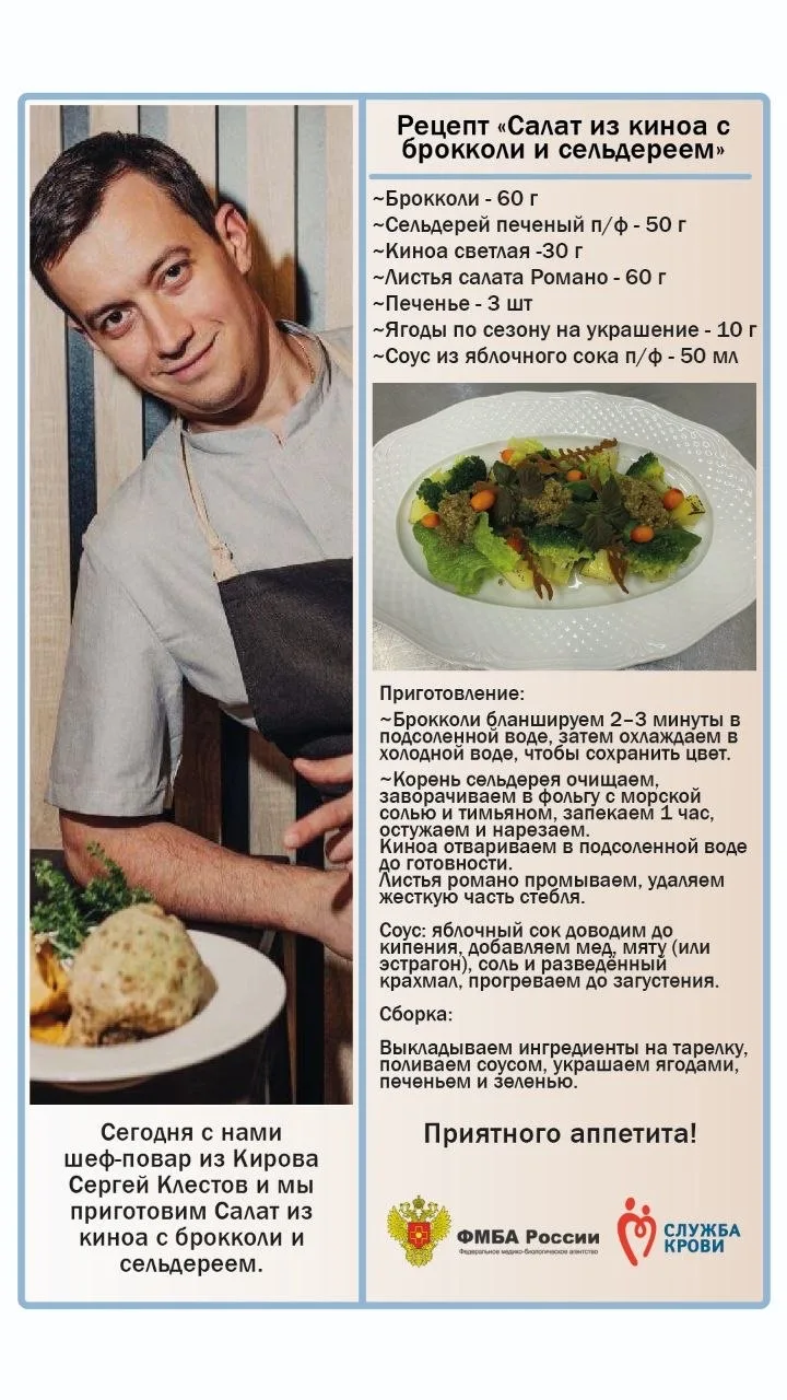 Питание донора накануне сдачи крови - это очень важно, и это знает каждый, кто приходит к нам на Станцию. Сегодня с нами шеф-повар из Кирова Сергей Клестов и мы приготовим Салат из киноа с брокколи и сельдереем.