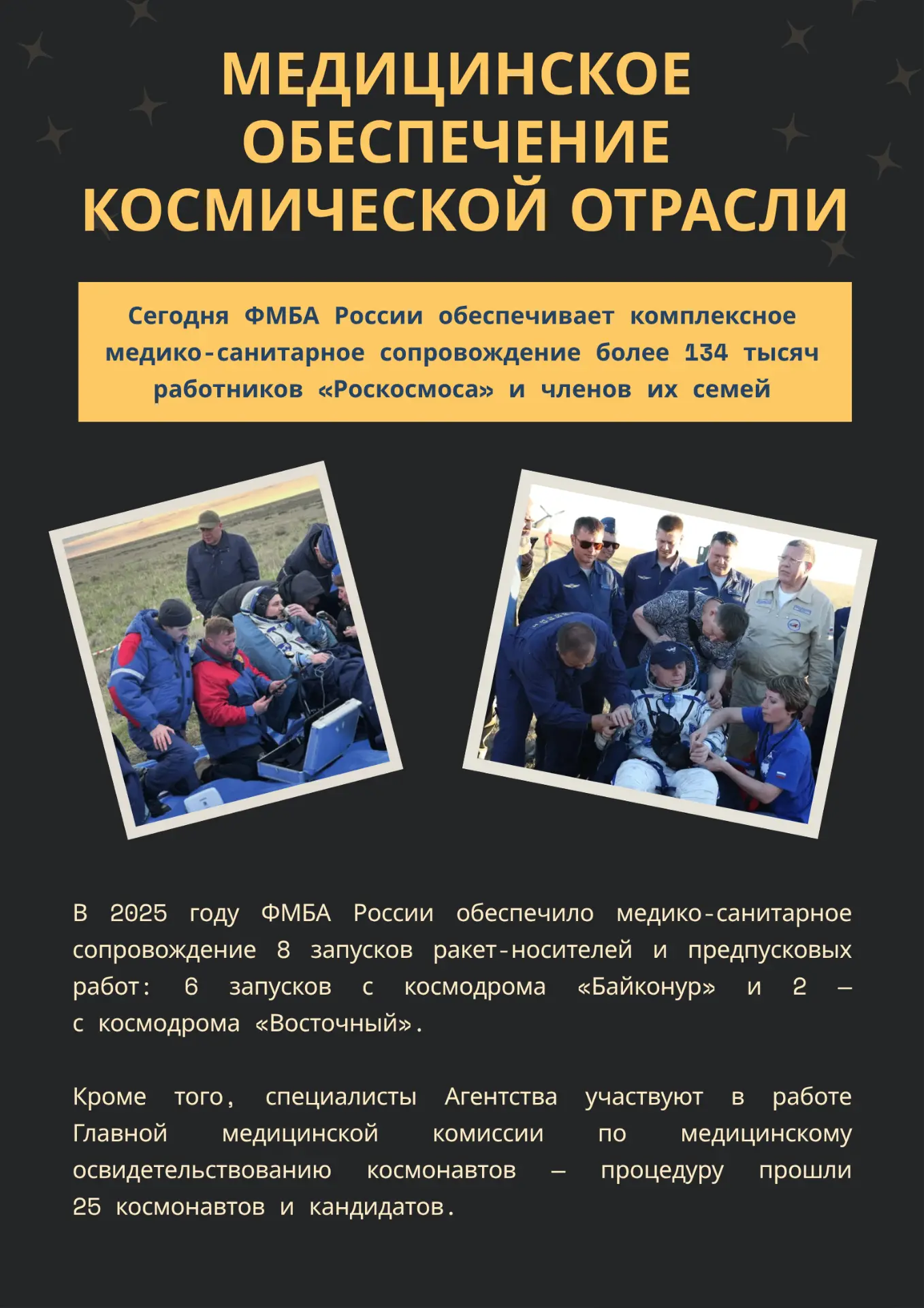 🩺 За десятилетиями космических достижений — важнейшая работа, без которой покорение космоса было бы невозможным. Об истории становления космической медицины, медицинском обеспечении космонавтов, современных научных разработках и перспективных проектах — в наших карточках.