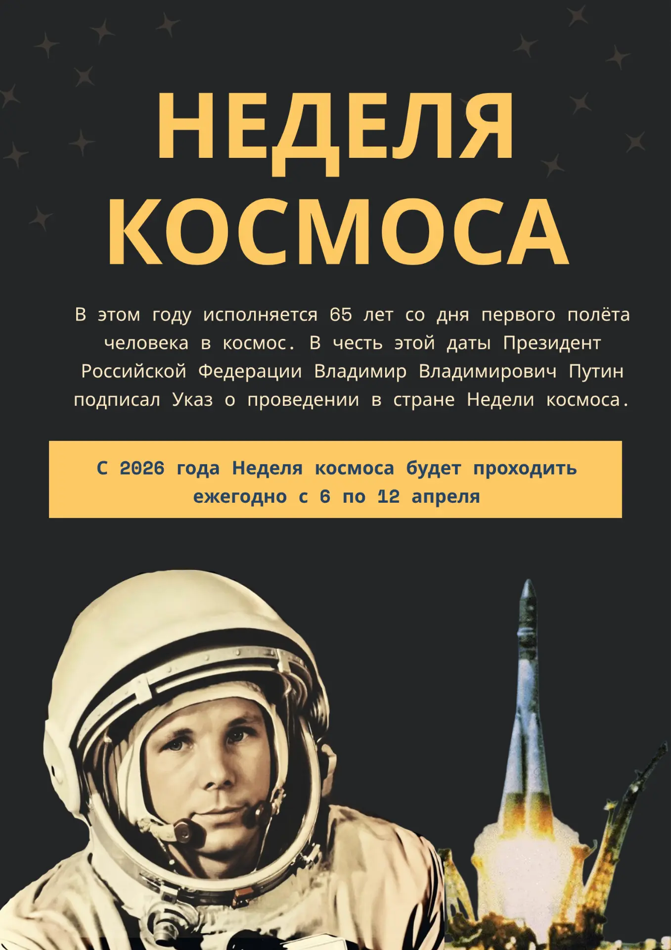 ✨ 🚀 В России стартовала Неделя космоса — указ о её проведении в честь 65-летия первого полёта подписал Президент Российской Федерации Владимир Владимирович Путин. С 2026 года она будет проходить ежегодно с 6 по 12 апреля.