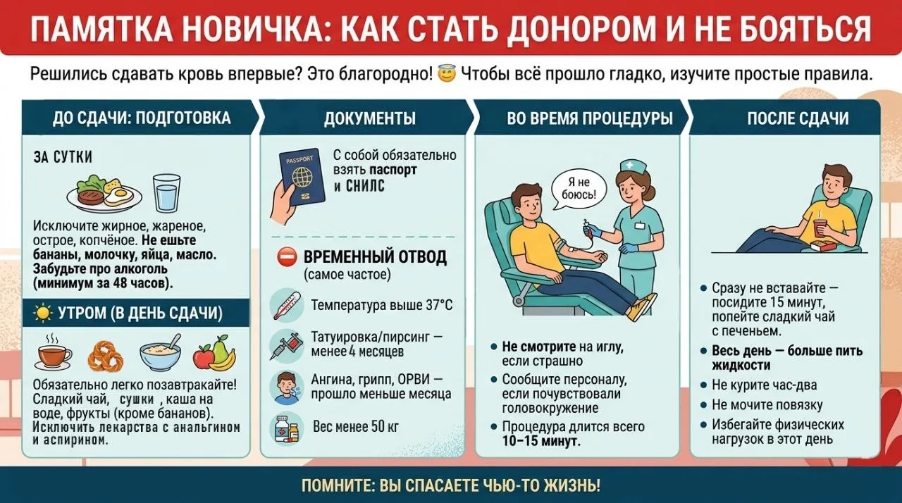 Решились сдавать кровь впервые? Это благородно! 😇 Чтобы всё прошло гладко, изучите простые правила. Сохраняйте пост, чтобы не забыть! 👇