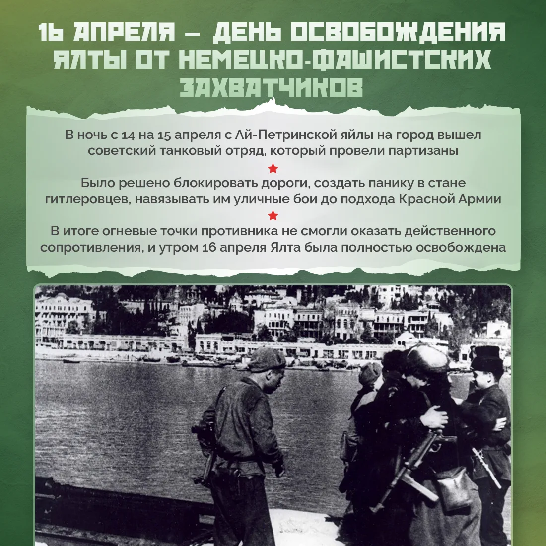 Ровно 82 года назад наш город вздохнул свободно – в ходе Крымской наступательной операции Ялта была освобождена от немецко-фашистских захватчиков. Мы помним подвиг воинов-освободителей и гордимся их мужеством.