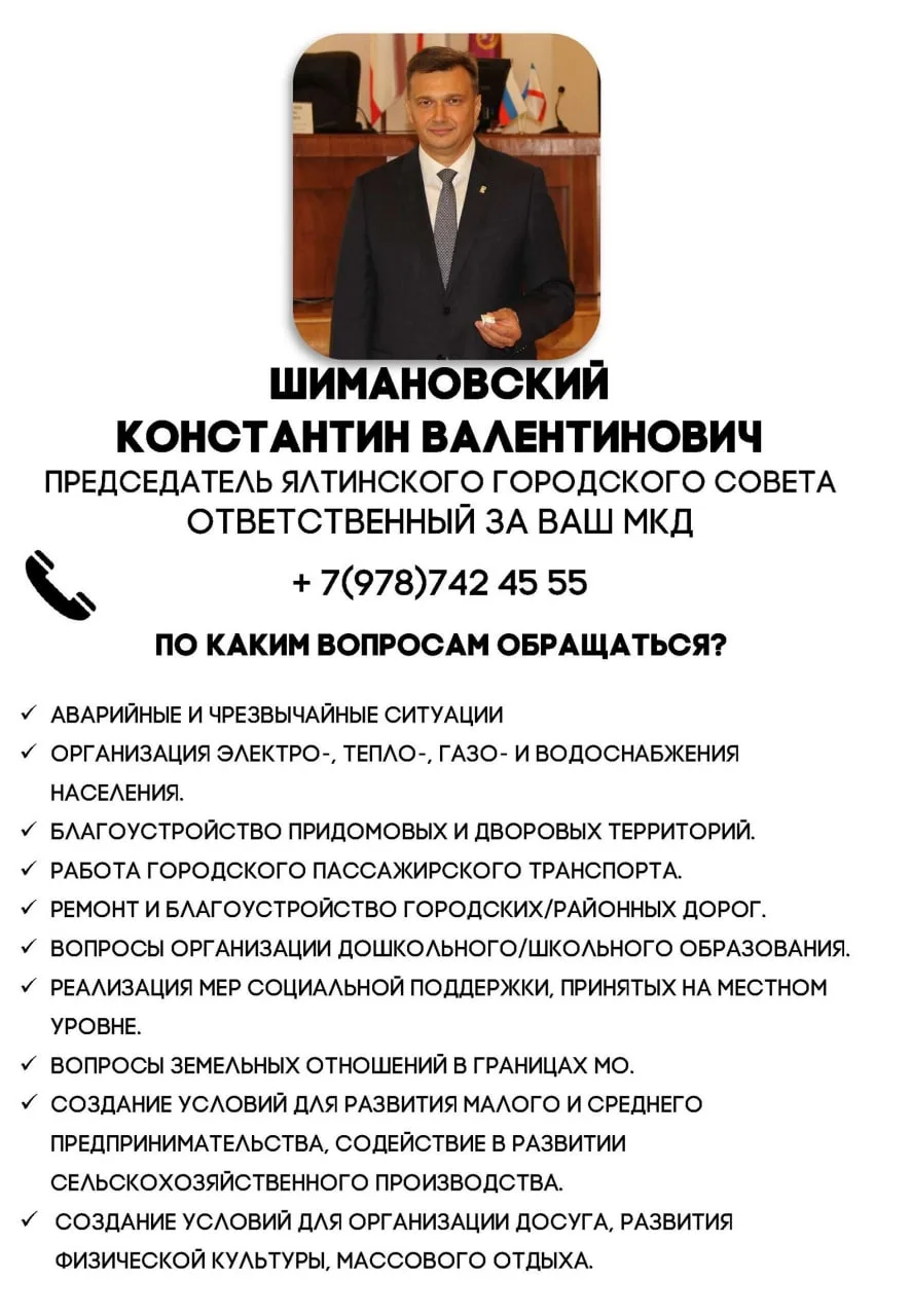 📌 Напомним, при возникновении вопросов, требующих реагирования, вы можете обратиться напрямую к Председателю Ялтинского городского совета Константину Шимановскому, главе администрации города Ялта Янине Павленко и её заместителям, закрепленным за территорией вашего округа, а также депутатам Государственного Совета Республики Крым и городского совета Ялты в соответствии с мажоритарными округами. Подробная информация по ссылке выше 👆