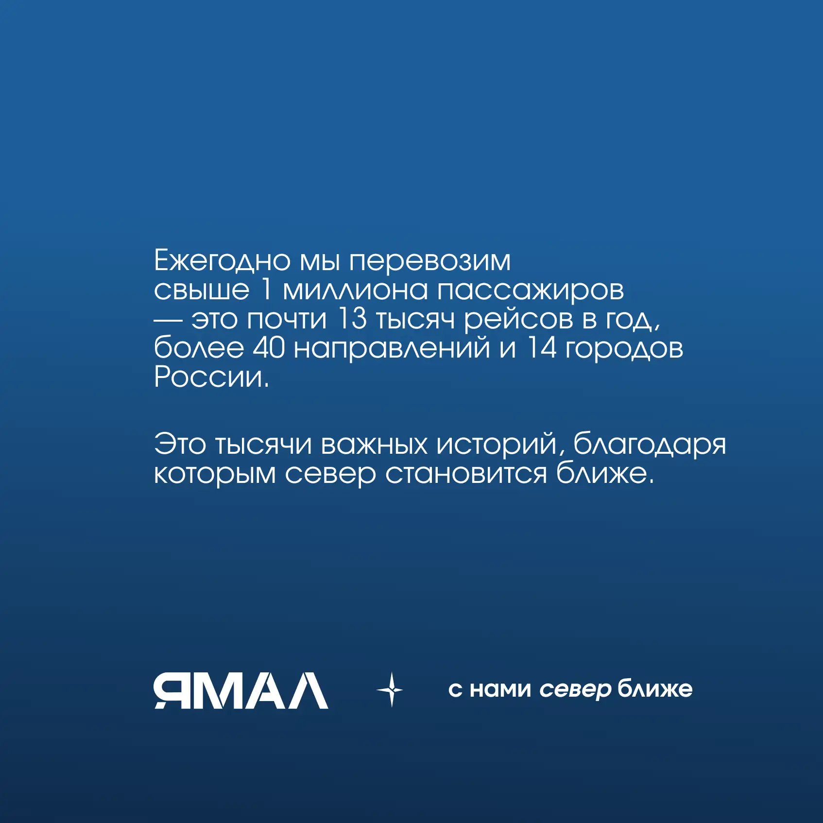 Авиакомпания "Ямал" гордится тем, что каждый день соединяет людей по всей стране. С нами Север ближе, а значит, и вся Россия становится единым целым.