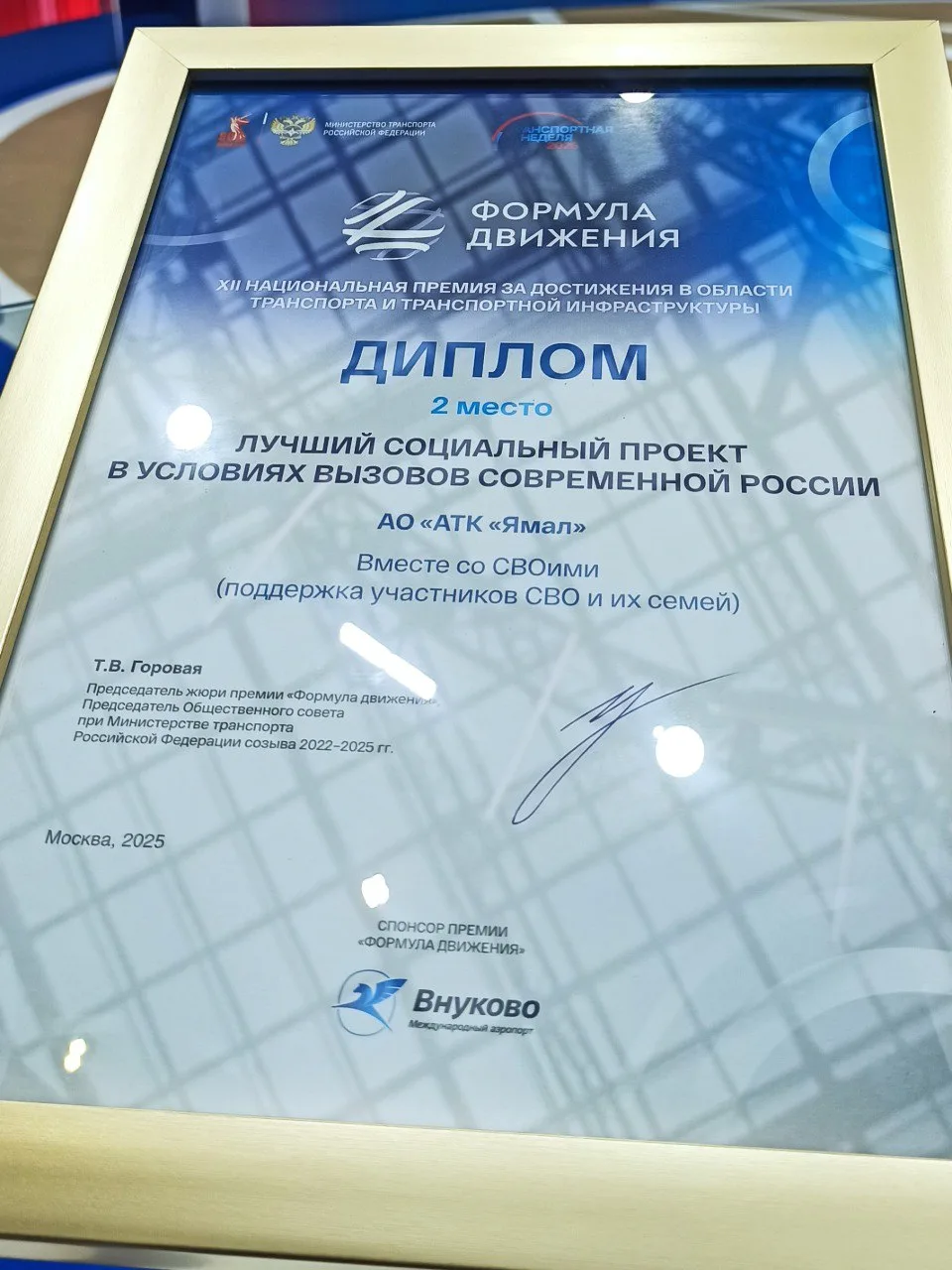 Программа "Вместе со СВОими" авиакомпании "Ямал" по поддержке участников СВО и их семей получила второе место в номинации "Лучший социальный проект в условиях вызовов современной России".