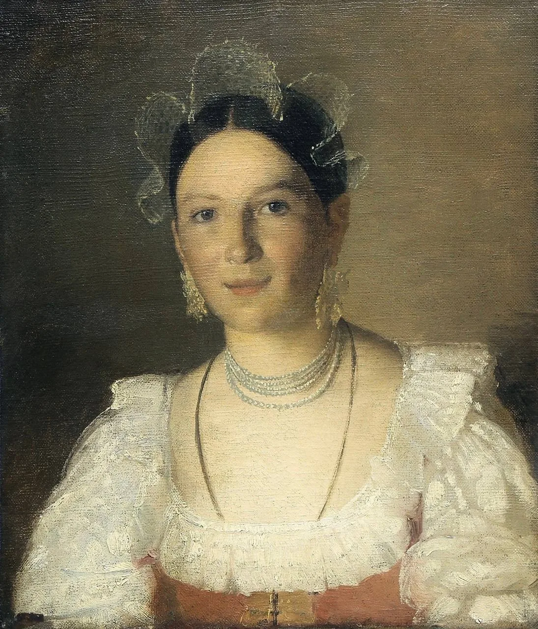 На девушке – нарядный девичий убор. Его обязательный элемент – поднизь или сетка, которую плели из белого конского волоса и местного жемчуга, добытого в реках Олонецкой губернии. Большой популярностью пользовались и другие жемчужные украшения – серьги, бусы, сохранившиеся в народном костюме вплоть до начала XX века.