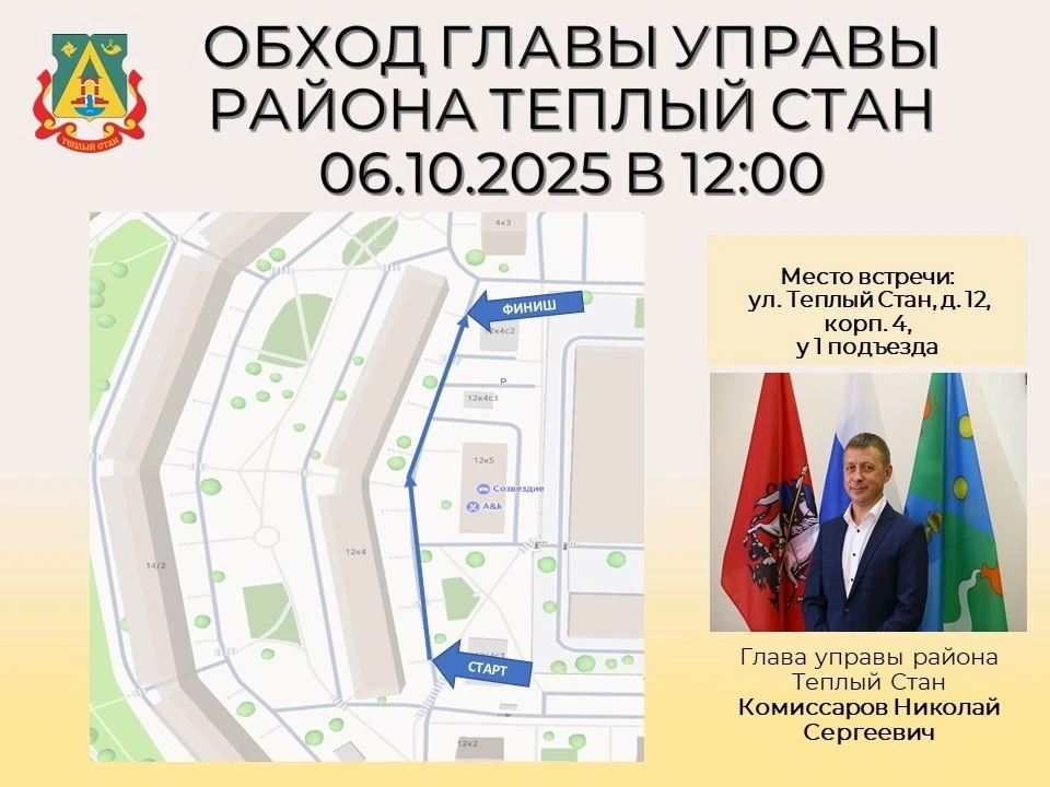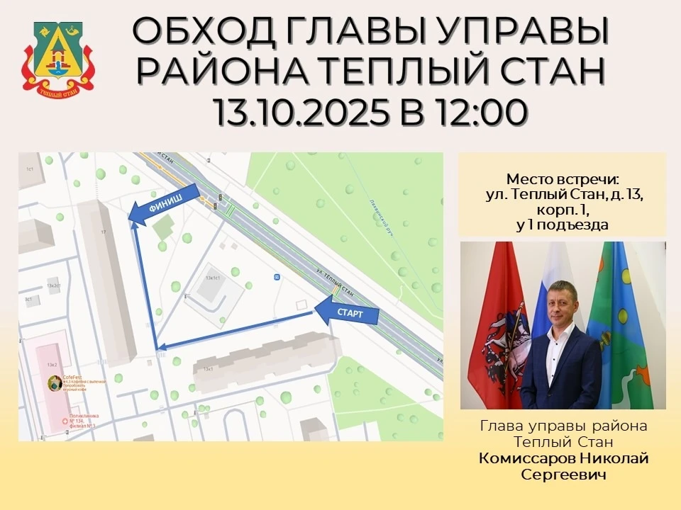 13 октября, в 12:00, состоится обход территории с главой управы Теплого Стана Николаем Сергеевичем Комиссаровым.
