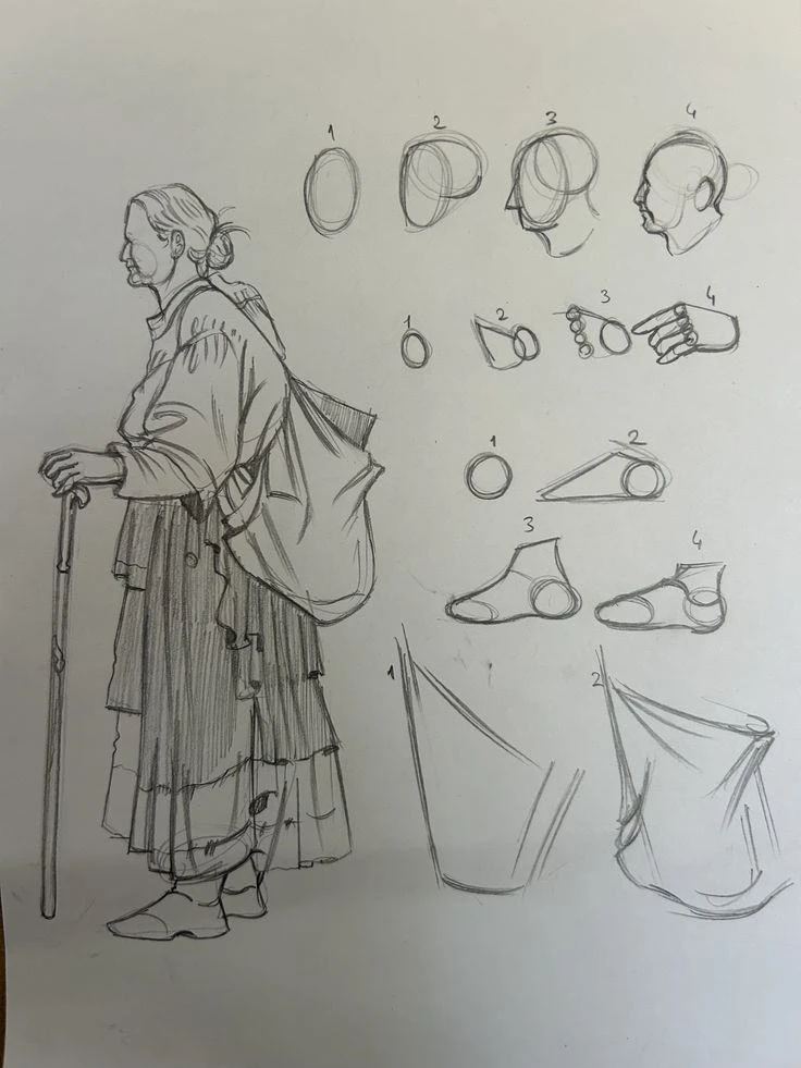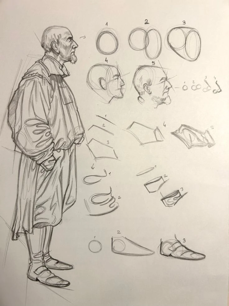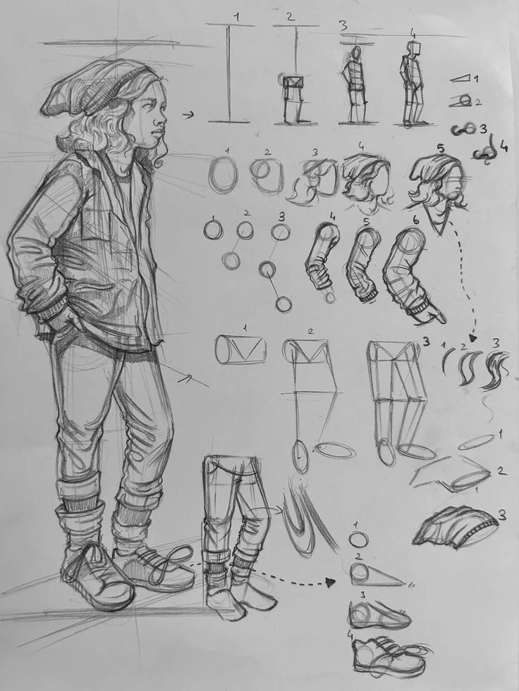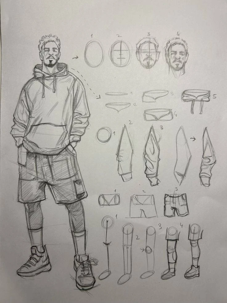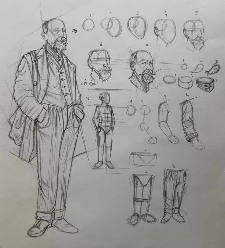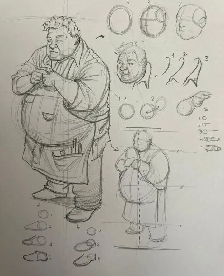 Зарисовки силуэтов людей различной фактуры с разверткой деталей