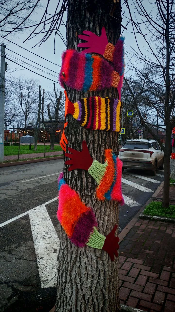 У магазина "Порт" деревья укутали в теплые, цветные шарфики.