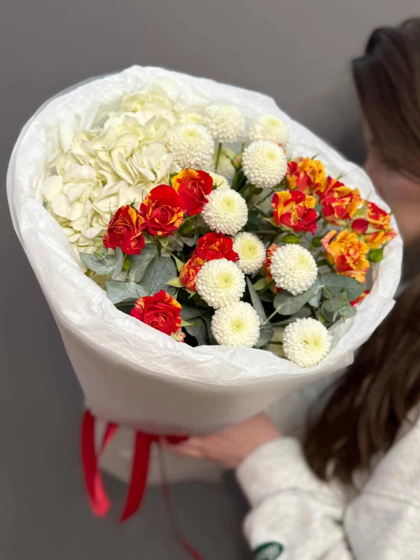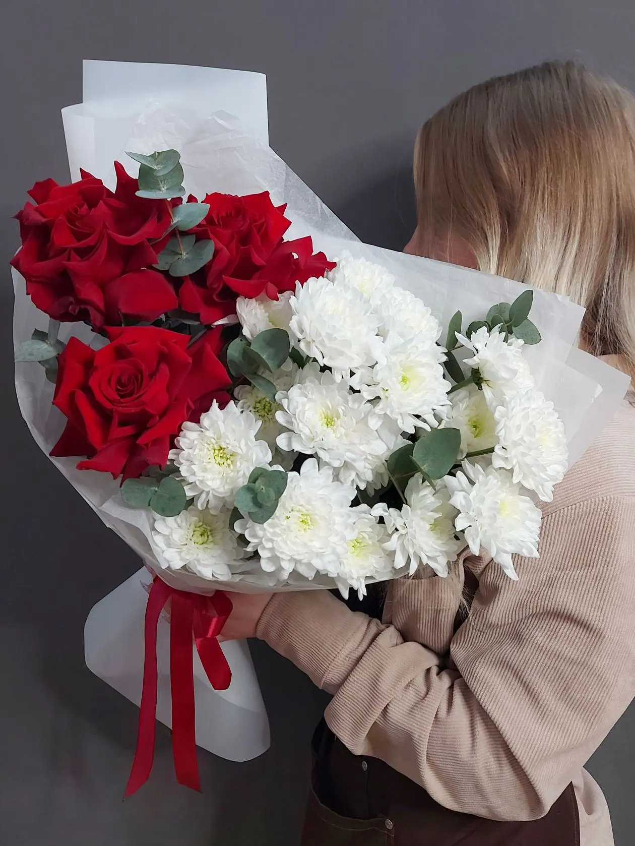 ❤️Авторский букет с бордовыми французскими розами , белыми кустовыми хризантемами и ароматными веточками эвкалипта