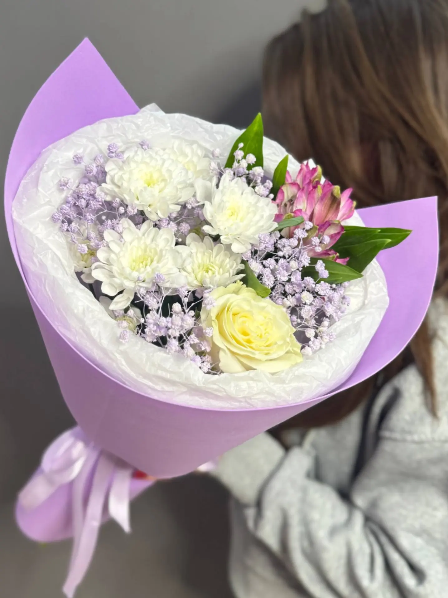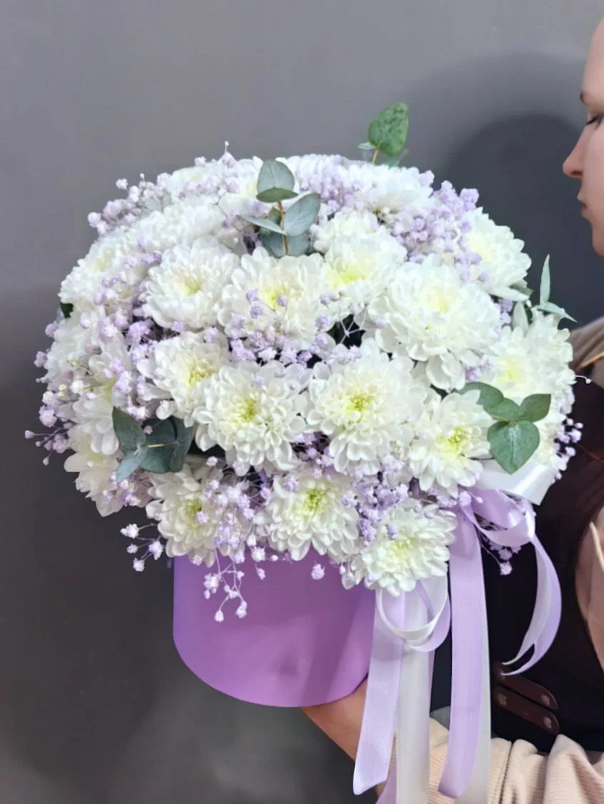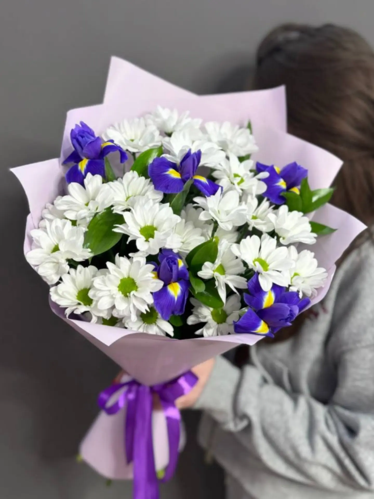 💜Авторский букет из белых кустовых хризантем и ирисов