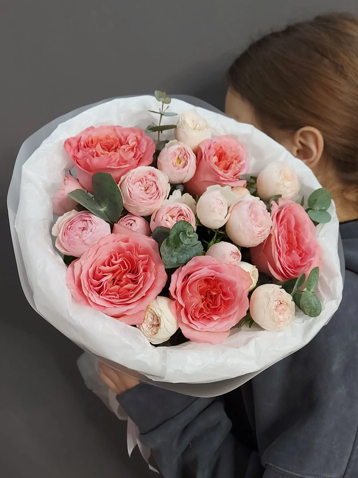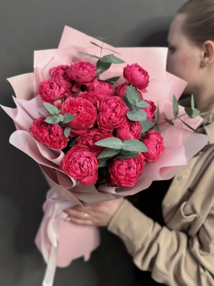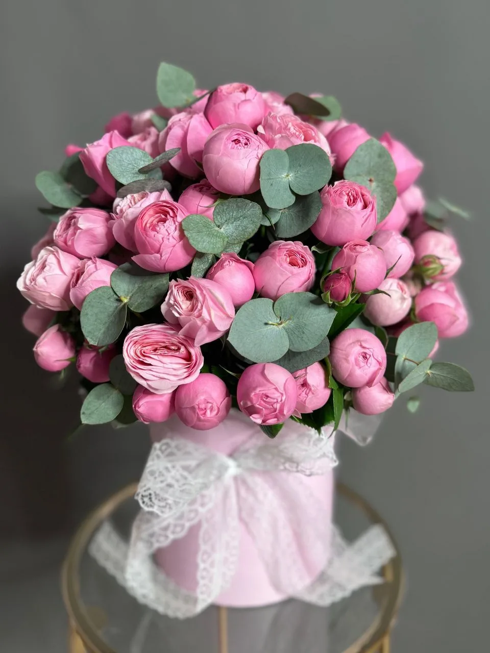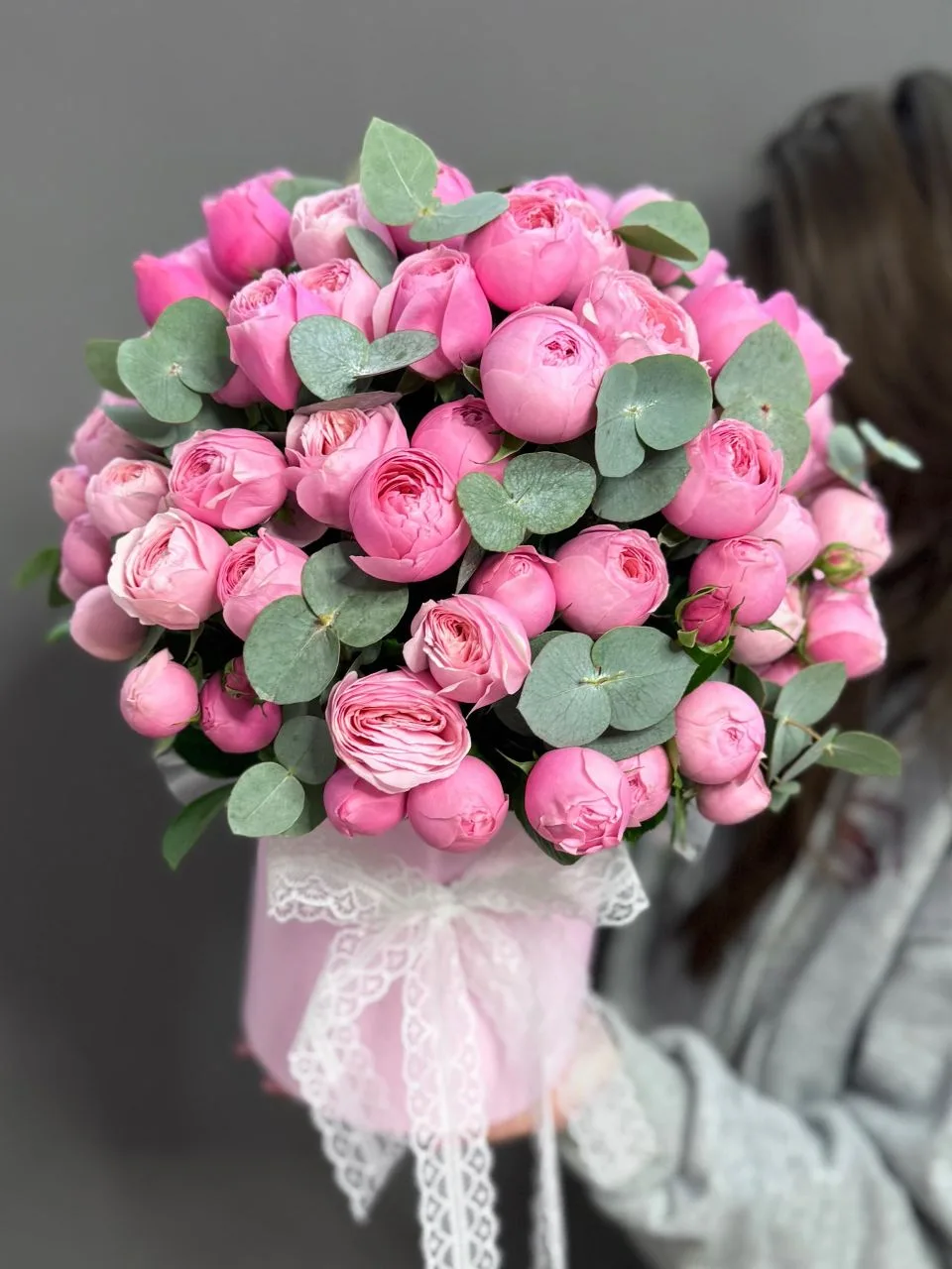 💞Композиция с кустовыми пионовидными розами сорта "Силва Пинк" и веточками эвкалипта