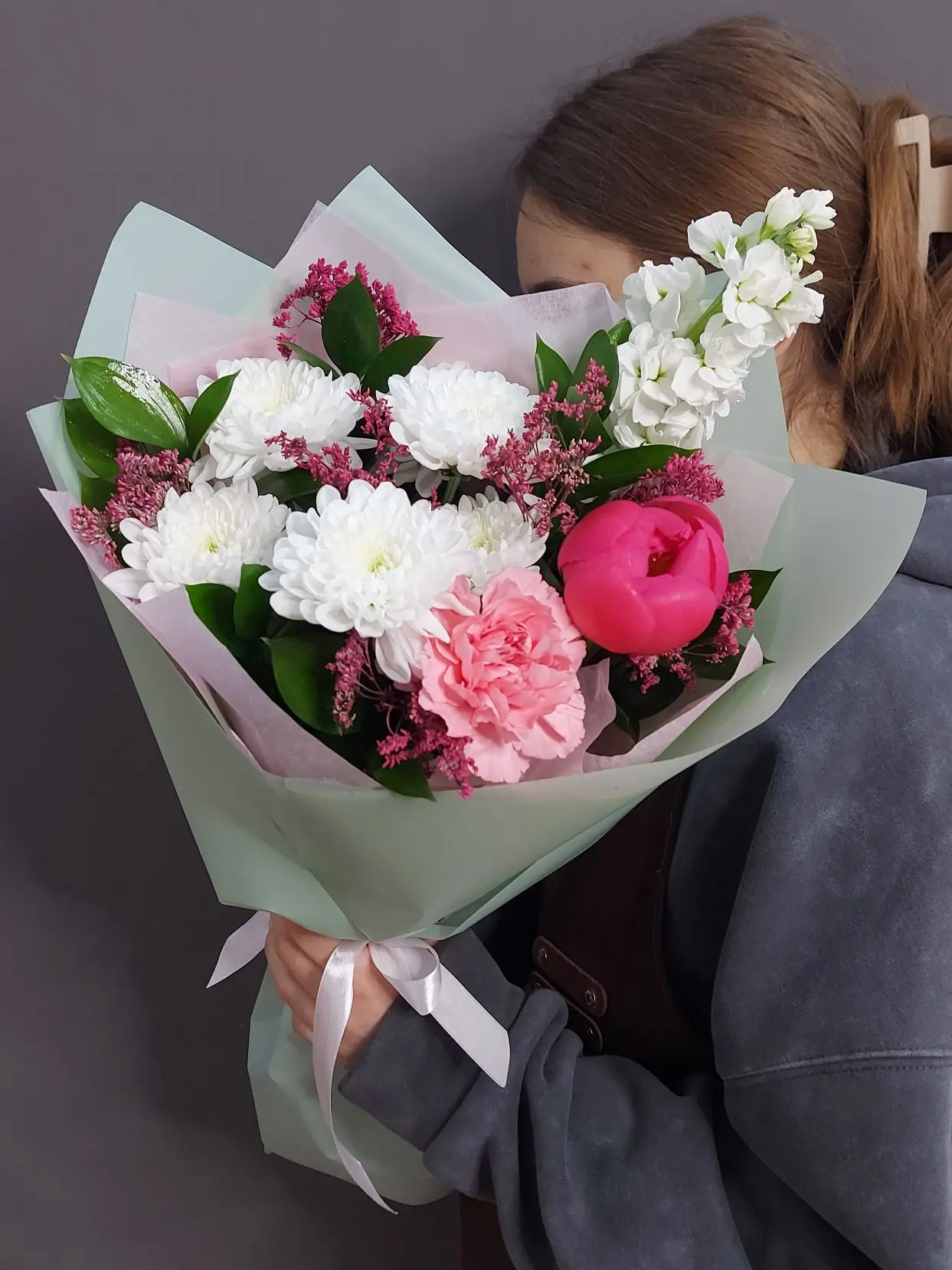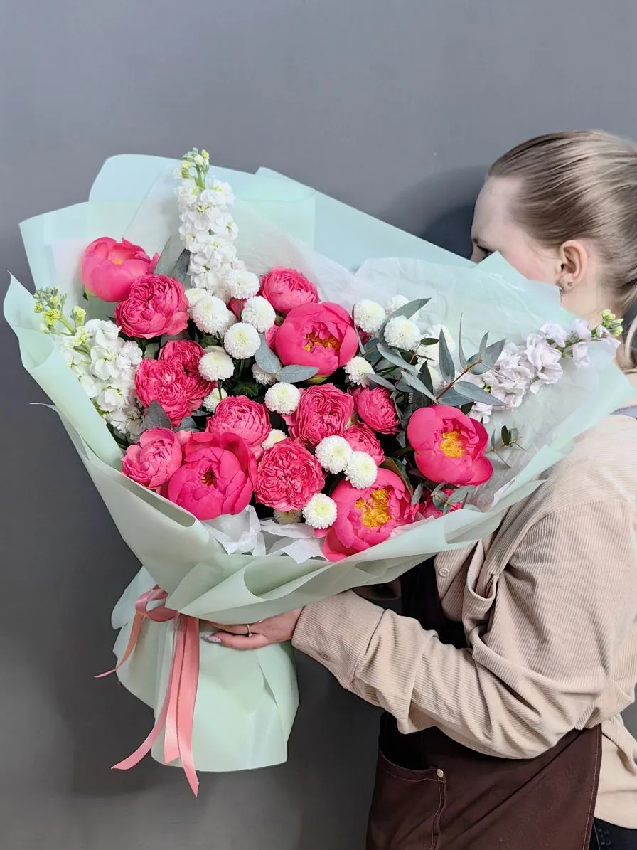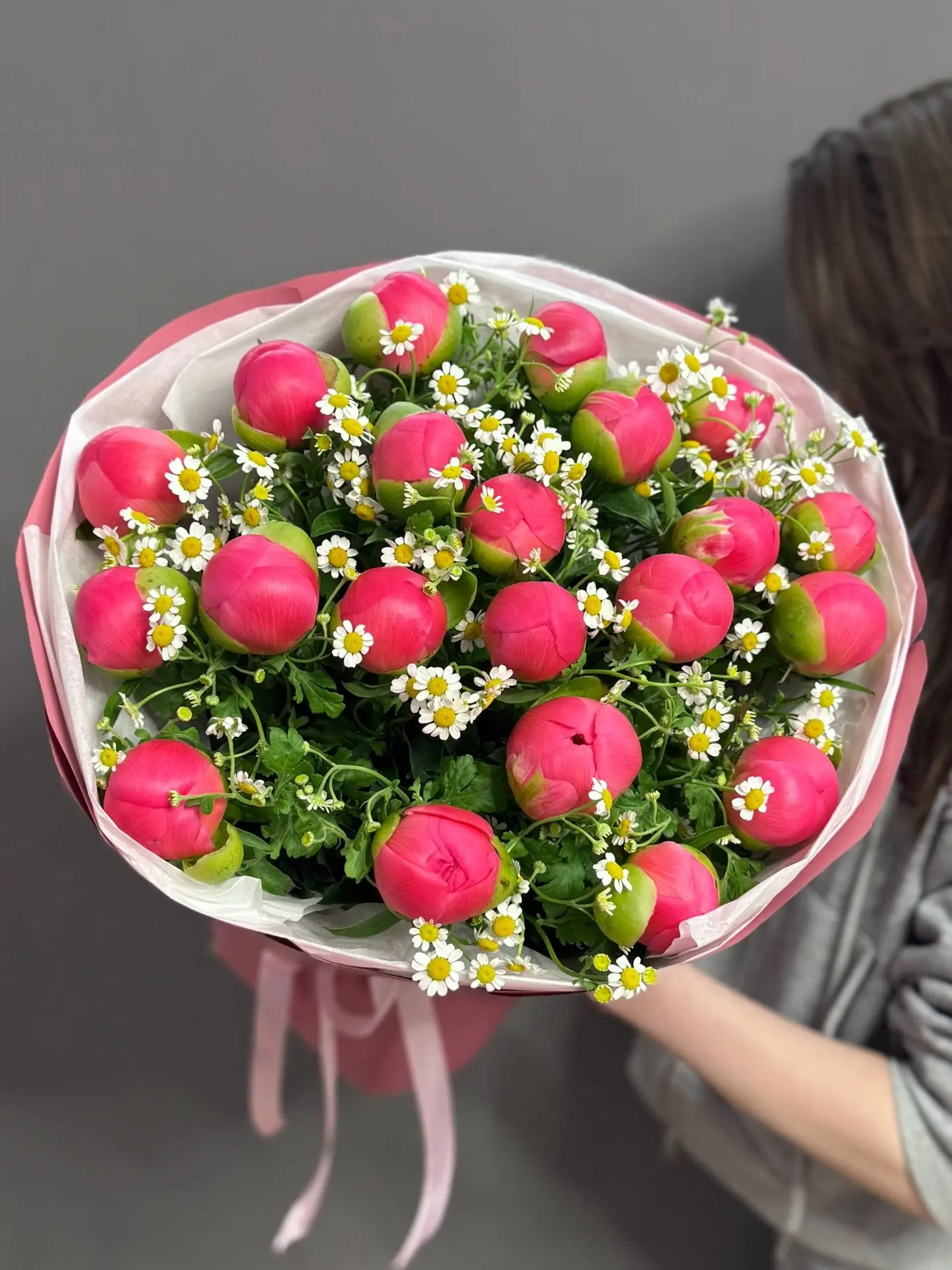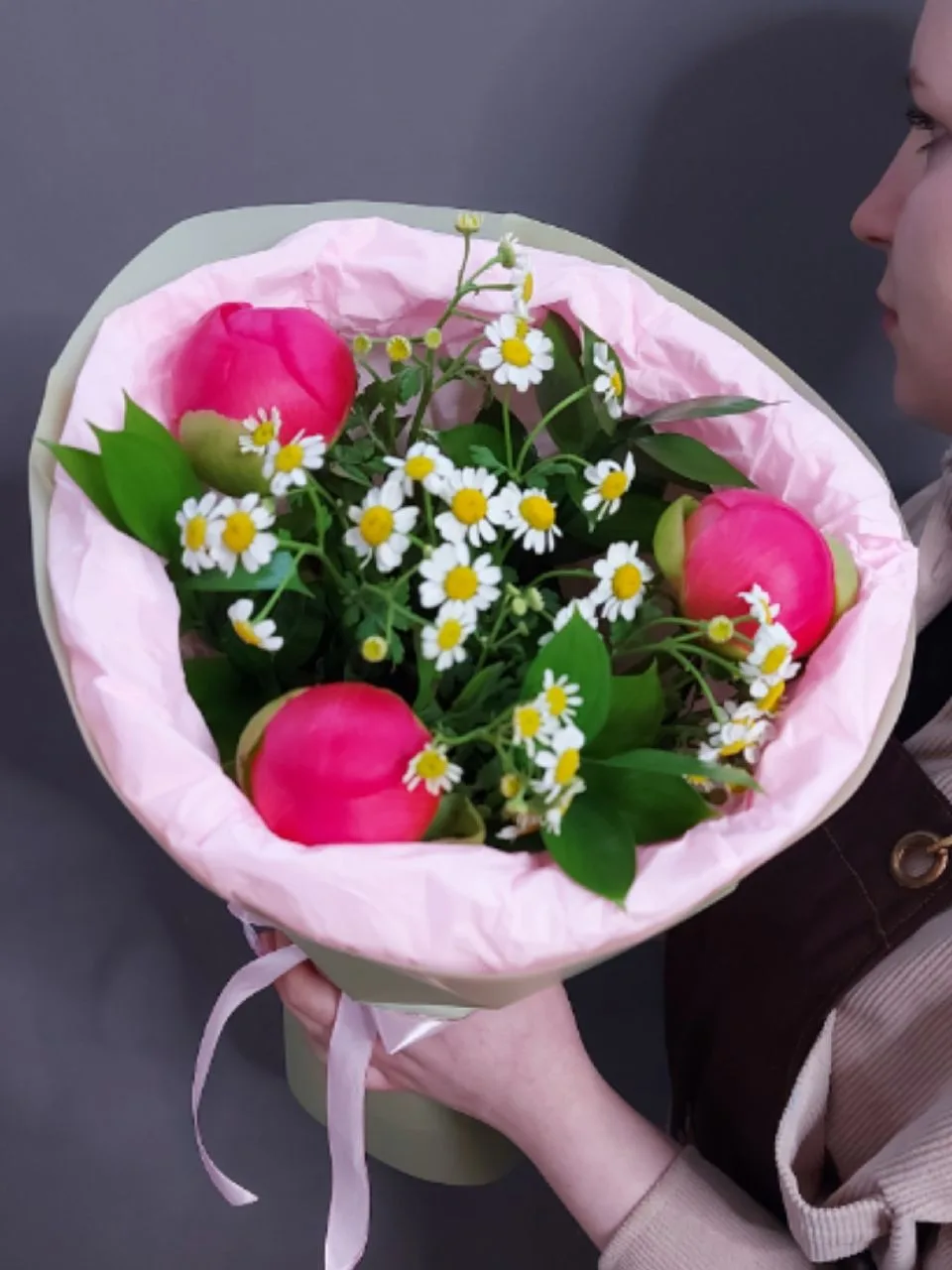 💕Дуо-букет с пионами сорта «Корал Шарм» и ароматными полевыми ромашками