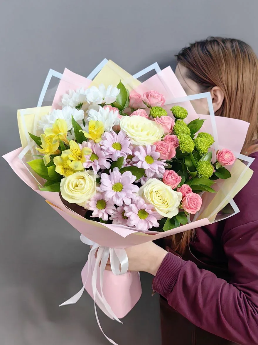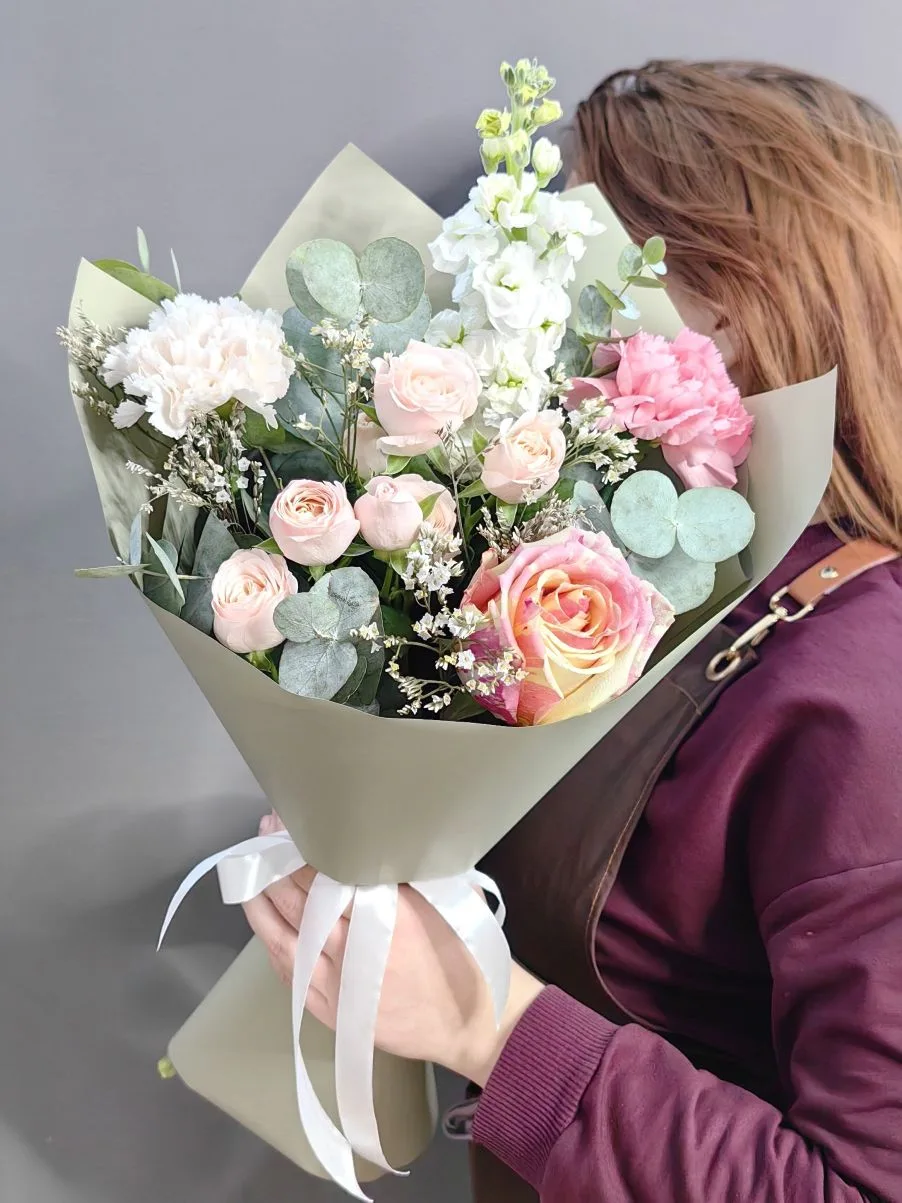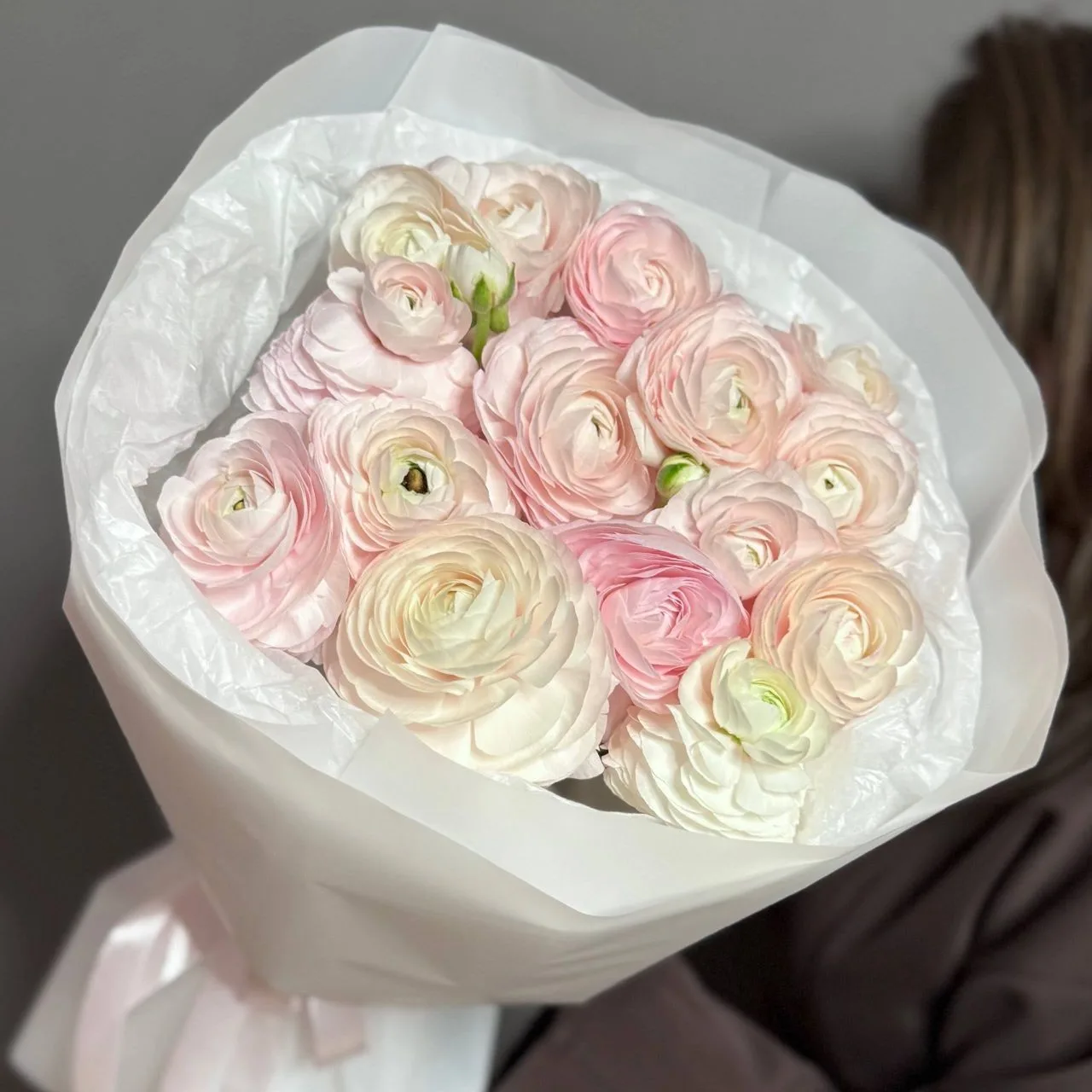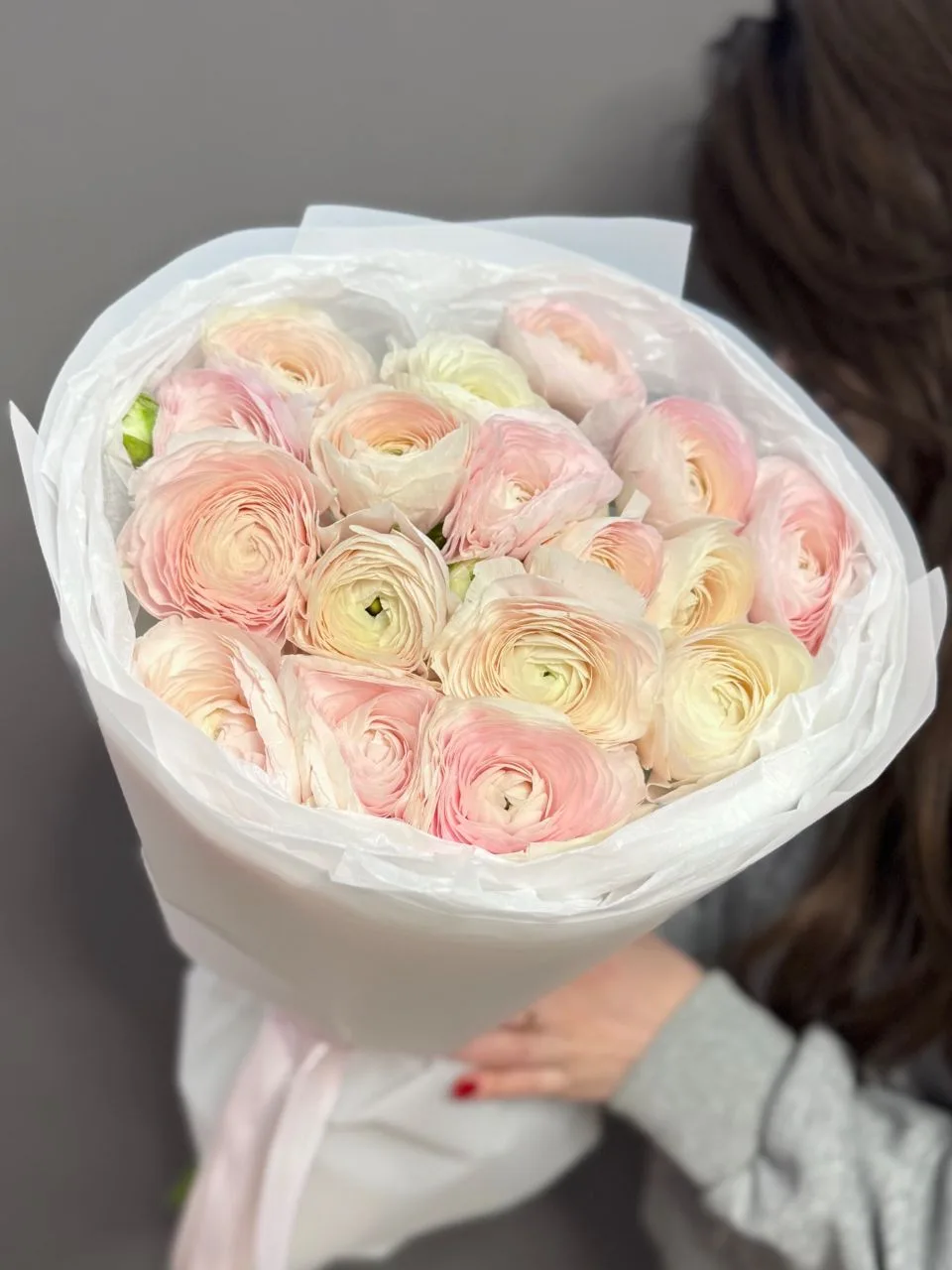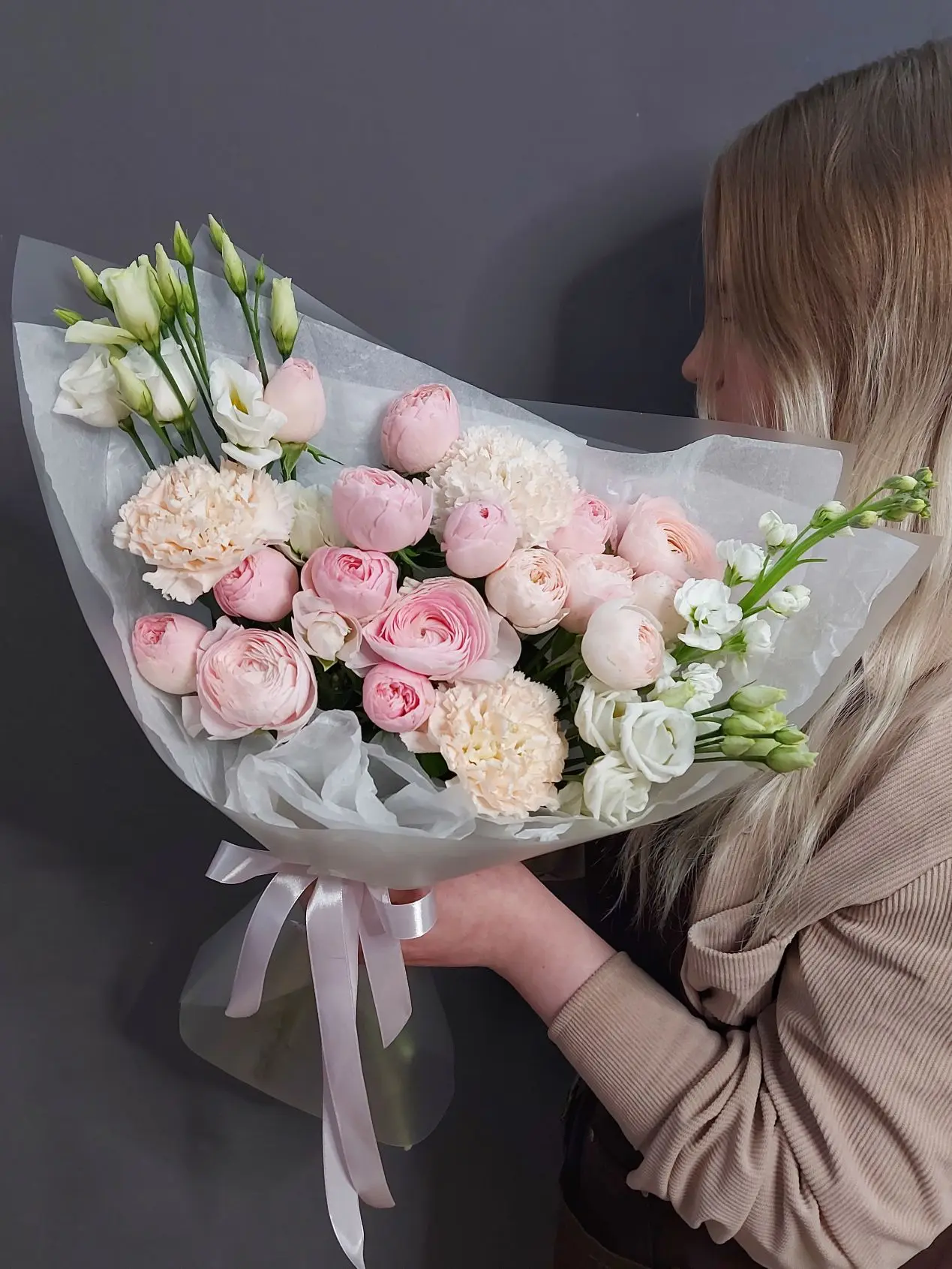 🌸Авторский букет в нежной гамме с ранункулюсами, кустовыми пионовидными розами , ароматной матиолой, диантусами и эустомой