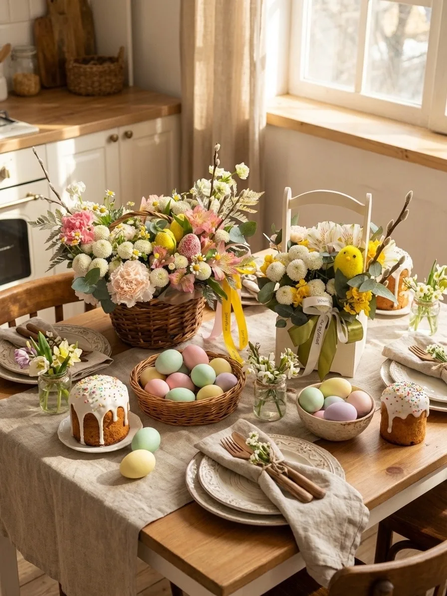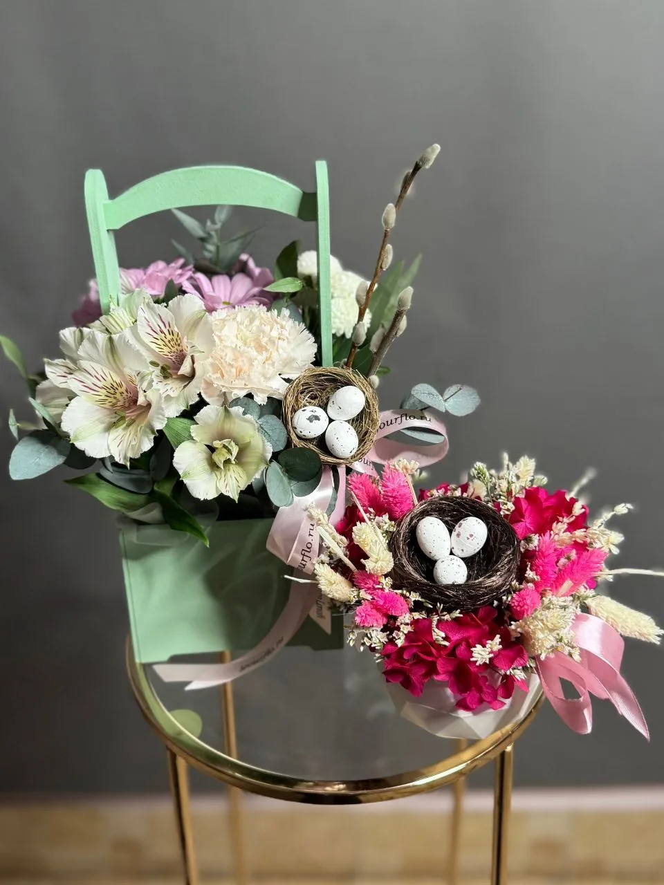 В каждой композиции в составе есть тематический декор, который хочется рассматривать бесконечно: от декоративных пасхальных яиц, пушистых веточек вербы до милейших цыплят и гнездышек 🥹