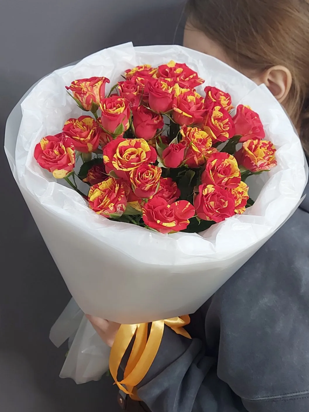❤️Букет из кустовых роз сорта "Фаер Флеш" в оформлении