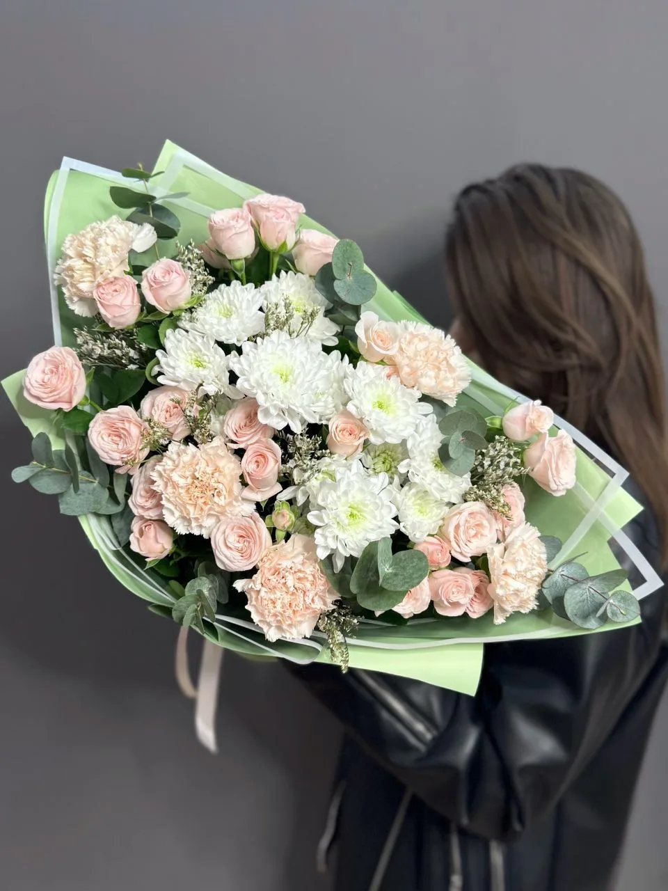 🌸Авторский букет в нежной гамме с кустовыми пионовидными розами сорта "Бомбастик"