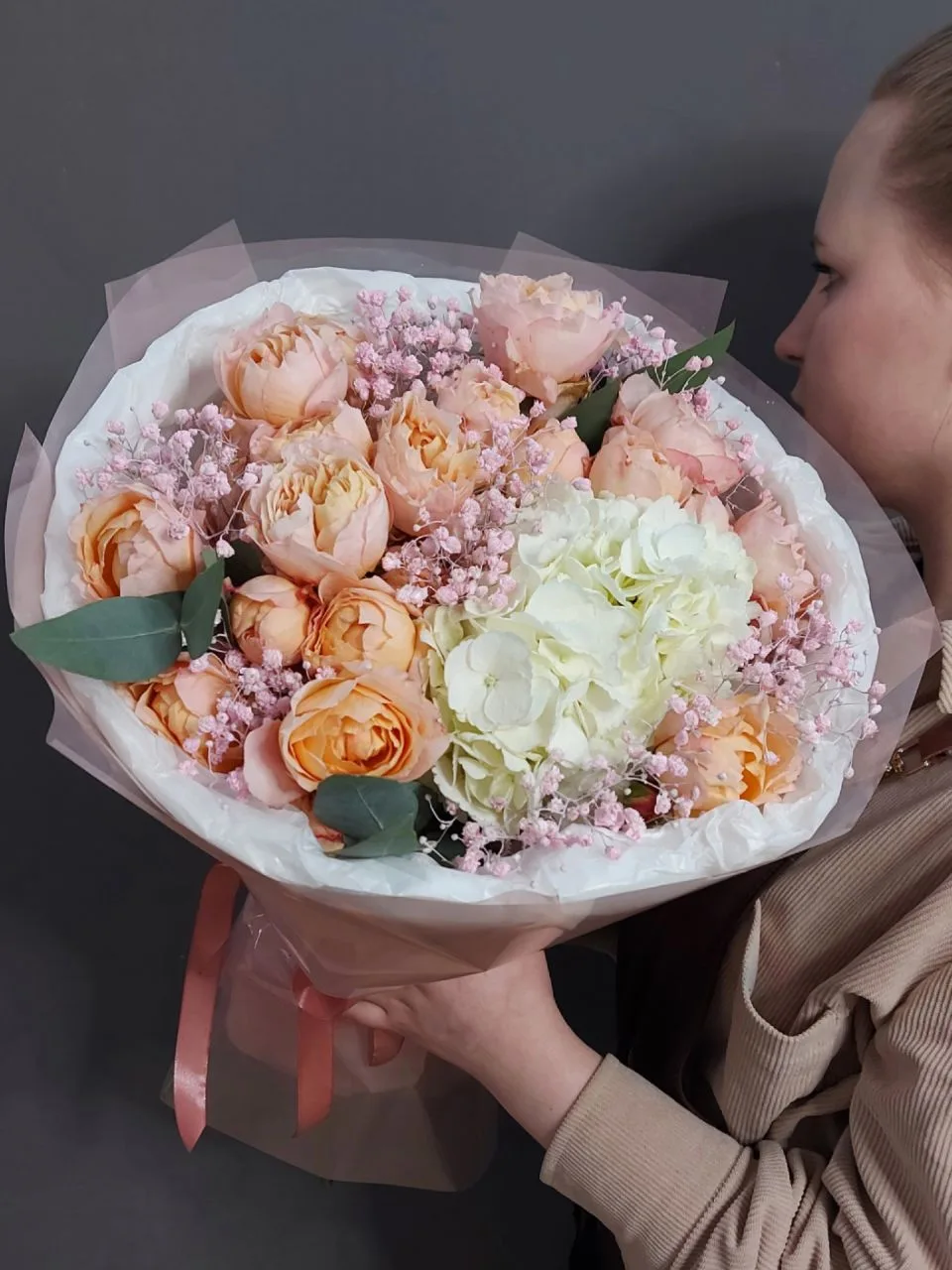 🌸Авторский букет с гортензией и кустовыми пионовидными розами сорта "Джульетта"