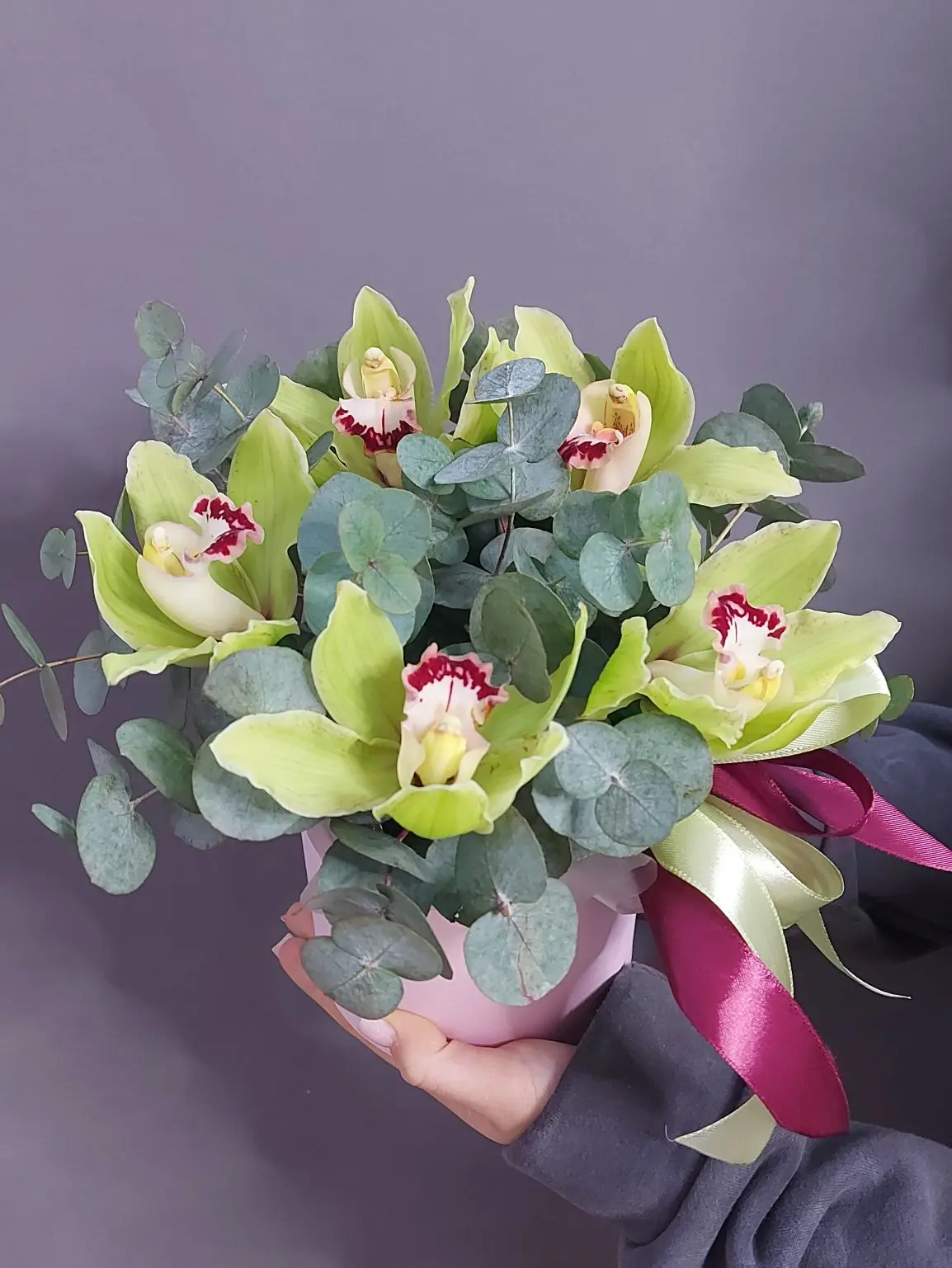 💚Композиция в шляпной коробке из 5 фисташковых орхидей и ароматных веточек эвкалипта