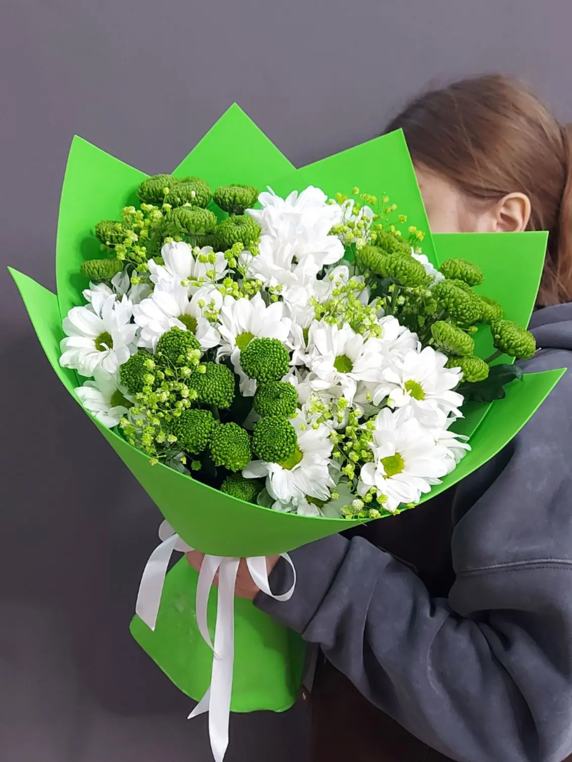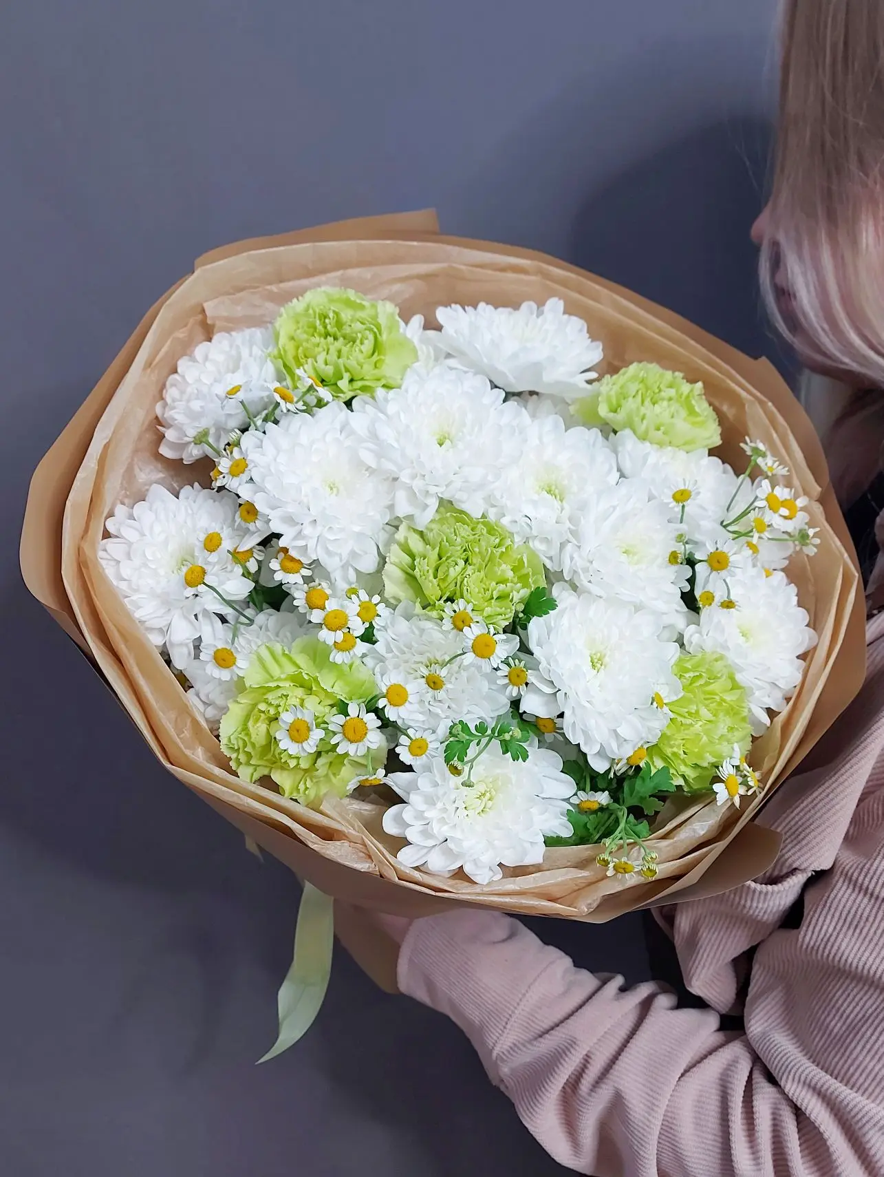 💚Авторский букет в бело-зеленой гамме из кустовых хризантем и гипсофилы