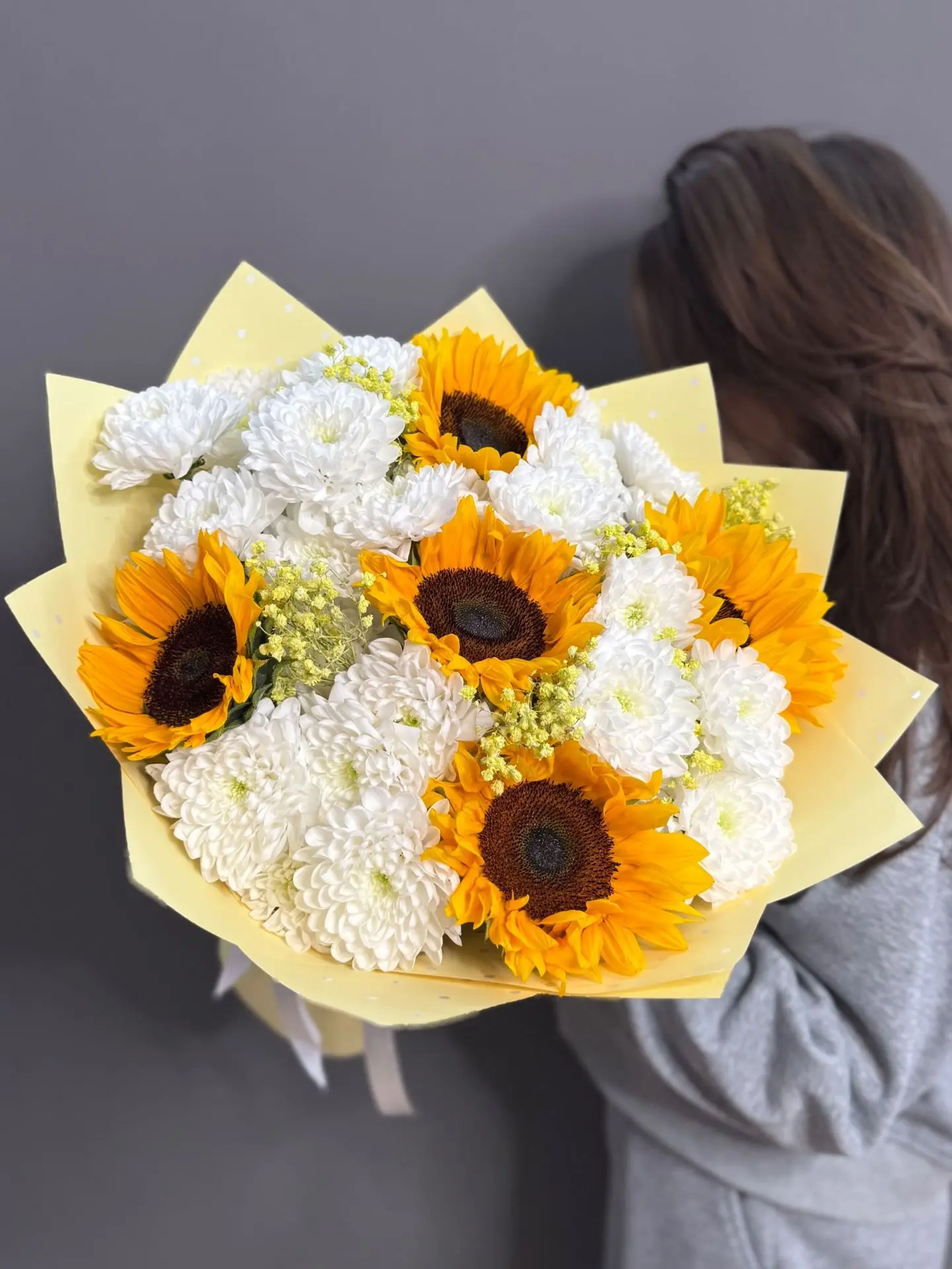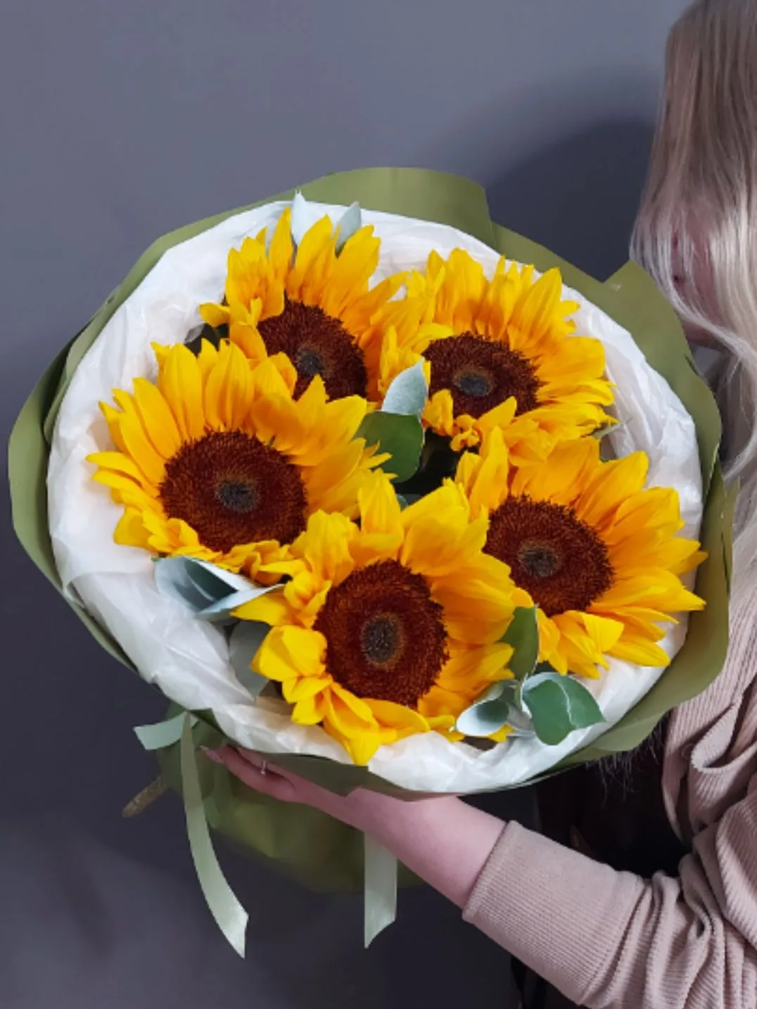 ☀️Монобукет из 5 солнечных подсолнухов с белыми веточками рускуса