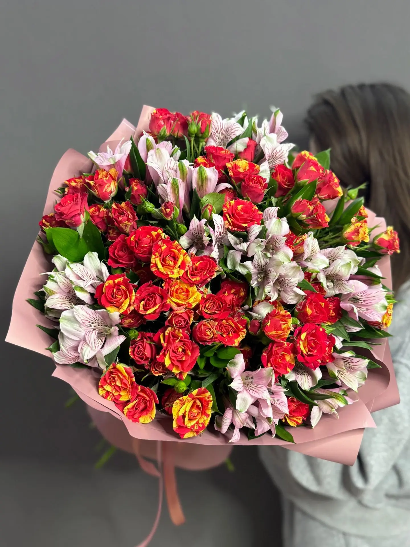 ❤️Дуо-букет с кустовыми розами сорта "Файер Флеш" и альстромериями
