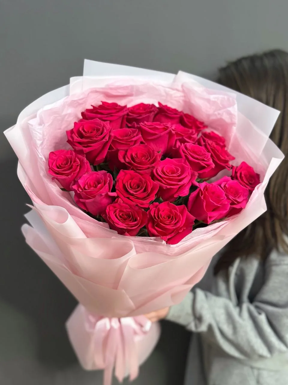 💖Букет из 21 малиновых роз сорта "Пинк Эксплорер" в оформлении