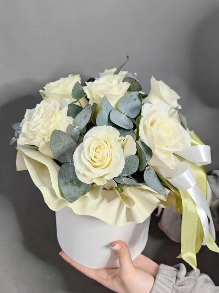 ☁️Композиция в шляпной коробке из 7 белых эквадорских роз и ароматных веточек эвкалипта