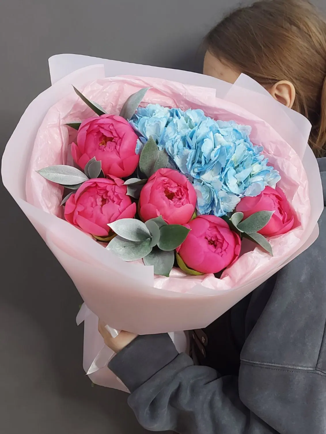 💕Авторский букет с колумбийской гортензией и коралловыми пионами сорта "Корал Шарм"