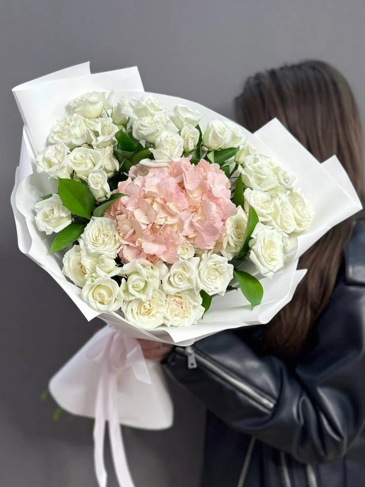 🌸Авторский букет с розовой гортензией и белыми кустовыми пионовидными розами сорта "Джанин"