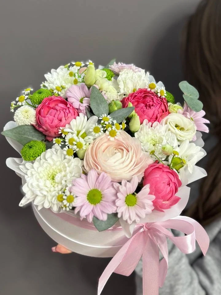 🌸Композиция в шляпной коробке с ранункулюсом и кустовыми пионовидными розами