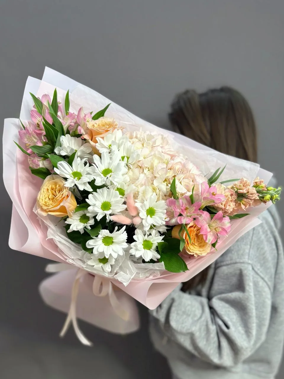 💕Авторский букет с кустовыми пионовидными розами сорта "Изабелла", ромашками и гортензией
