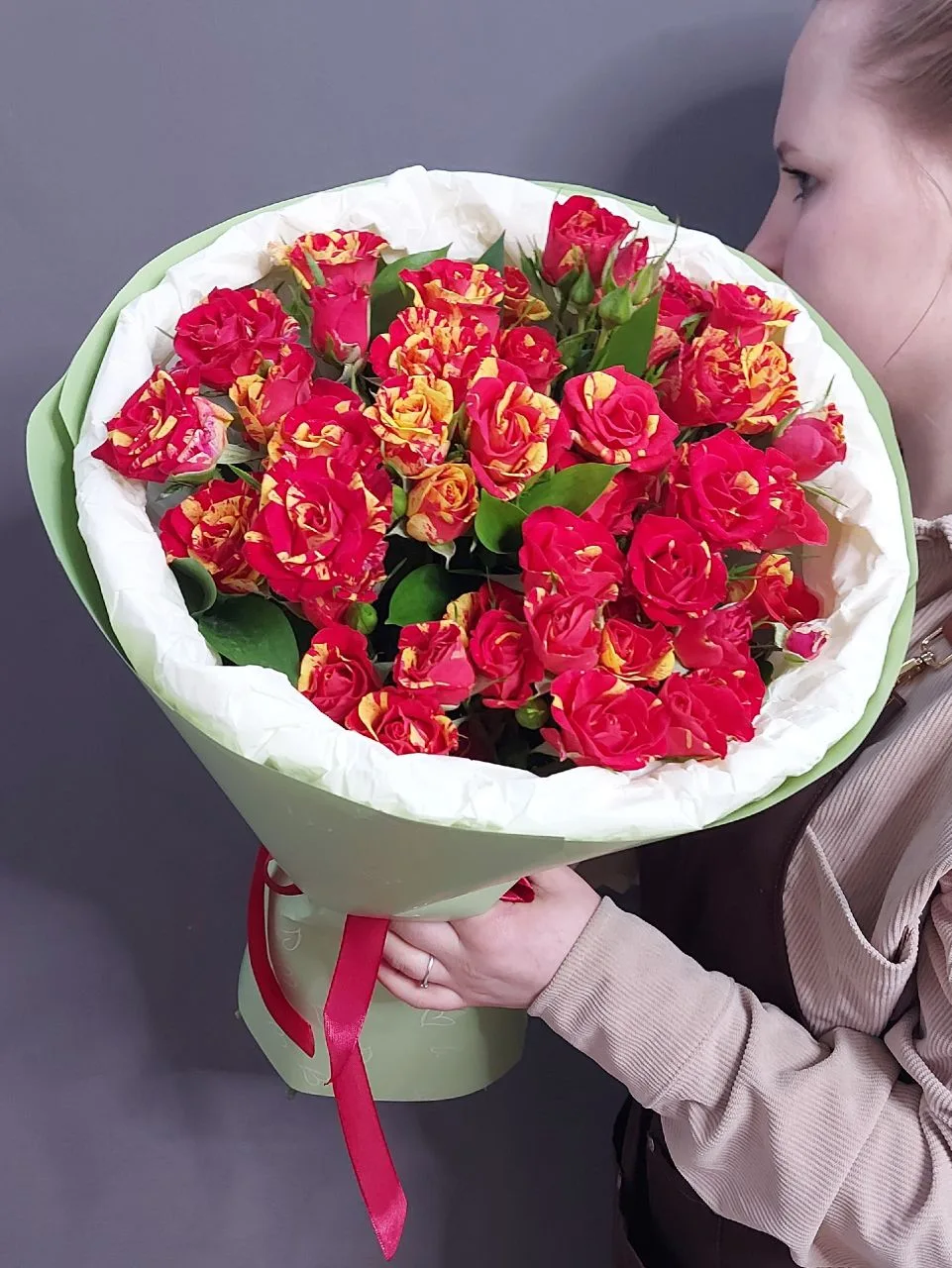 ❤️Монобукет из кустовых роз сорта "Фаер Флеш" в оформлении