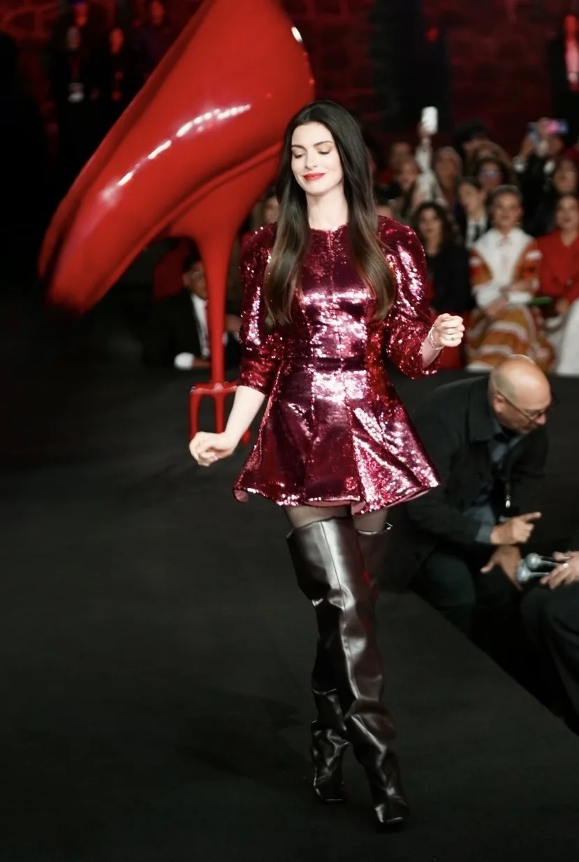 Наряд идеально дополняют ботфорты, что является отсылкой к культовой сцене с сапогами Chanel из первой части фильма.