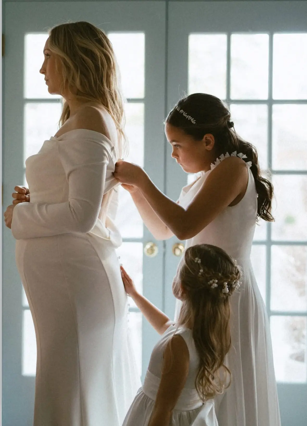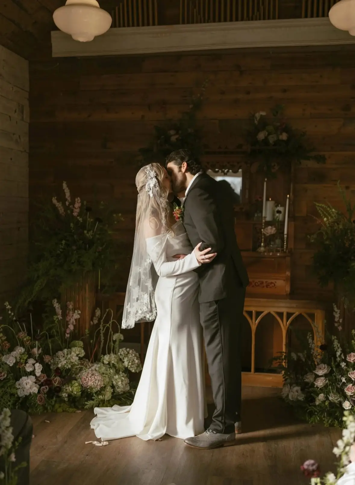 Свадебная церемония прошла в интимной обстановке, но особое внимание привлекало даже не место мероприятия, а потрясающее платье невесты от фирмы Grace Loves Lace.